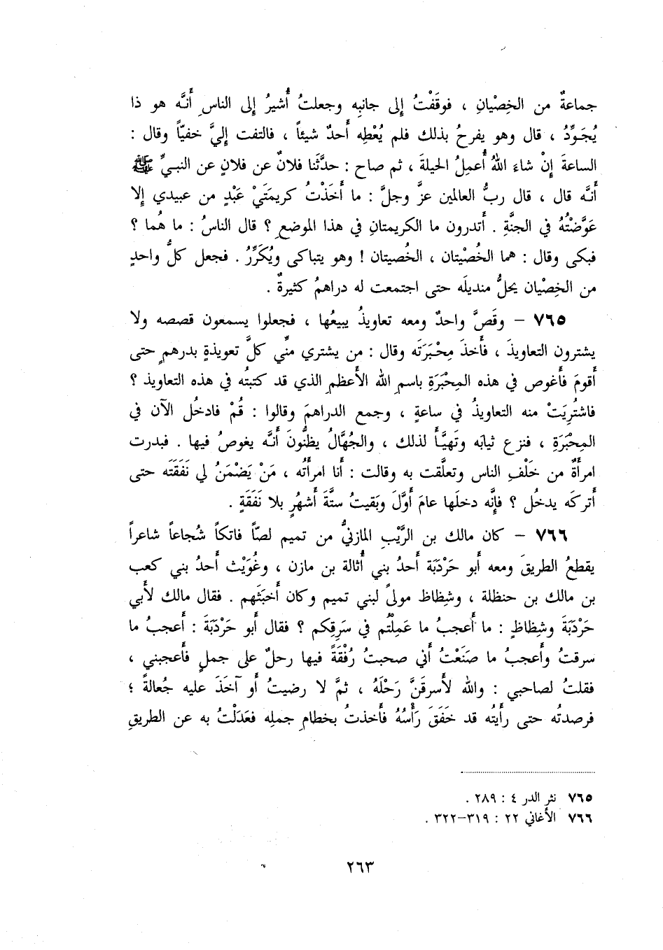 «765» - وقصّ واحد ومعه تعاويذ يبيعها، فجعلوا يسمعون قصصه ولا يشترون التعاويذ، فأخذ محبرته وقال: من يشتري منّي كلّ تعويذة بدرهم حتى أقوم فأغوص في هذه المحبرة باسم الله الأعظم الذي قد كتبته في هذه التعاويذ؟