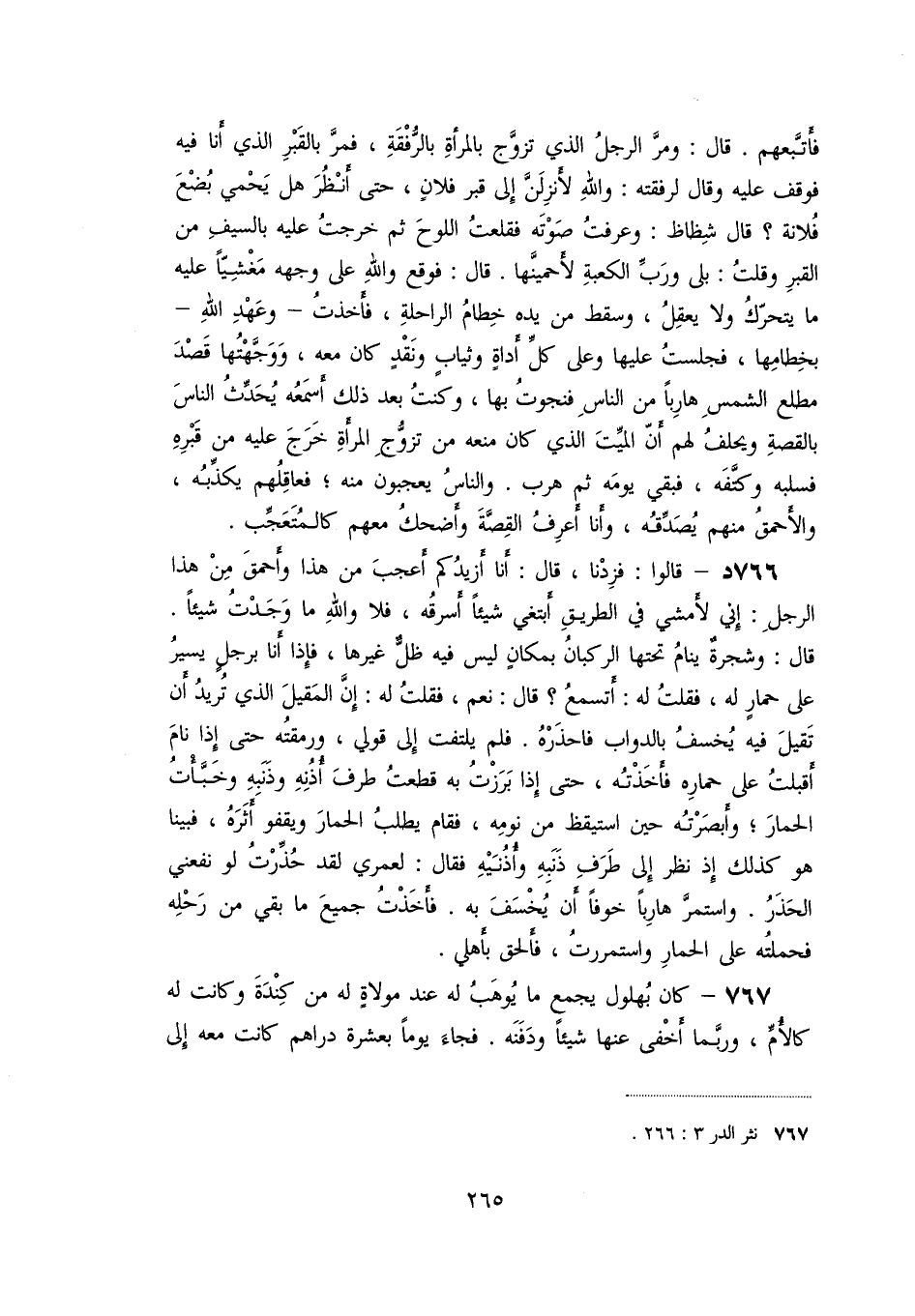 766 د- قالوا: فزدنا، قال: أنا أزيدكم أعجب من هذا وأحمق من هذا الرجل: إني لأمشي في الطريق أبتغي شيئا أسرقه، فلا والله ما وجدت شيئا.