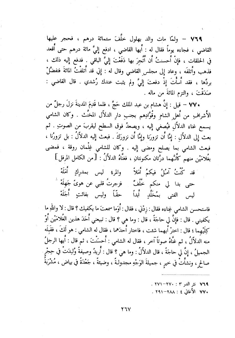 «770» - قيل: إنّ هشام بن عبد الملك حجّ، فلما قدم المدينة نزل رجل من الأشراف من أهل الشام وقوّادهم بجنب دار الدلّال المخنّث. وكان الشامي يسمع غناء الدلّال فيصغي إليه، ويصعد فوق السطح ليقرب من الصوت. ثم بعث إلى الدلّال: إمّا أن تزورنا وإمّا أن نزورك. فبعث إليه الدلّال: بل تزورنا، فبعث الشامي بما يصلح ومضى إليه. وكان للشامي غلمان روقة، فمضى بغلامين منهم كأنّهما درّتان مكنونتان، فغنّاه الدلّال: [من الكامل المرفل]