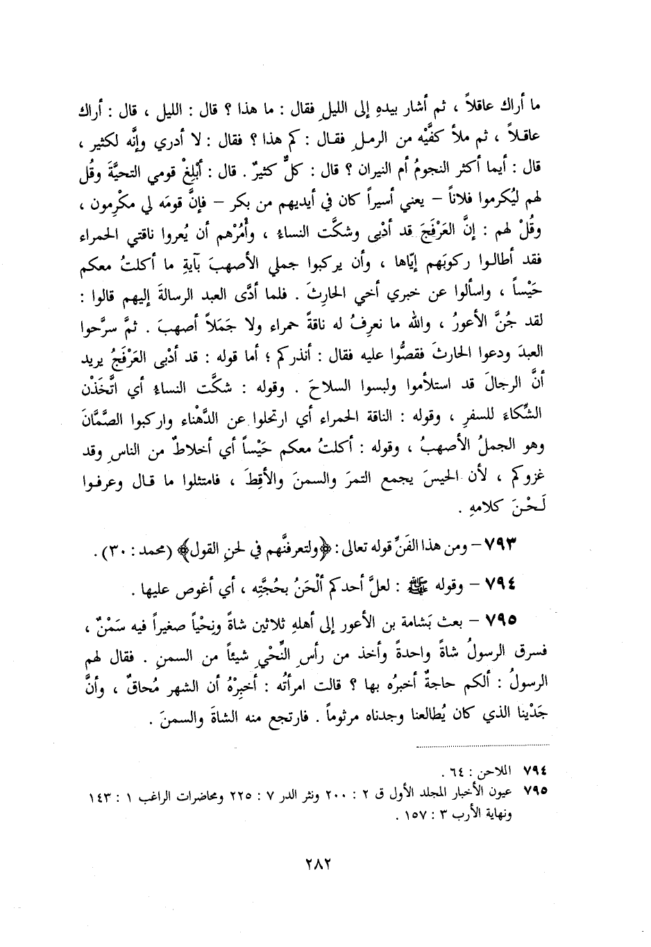 «795» - بعث بشامة بن الأعور إلى أهله ثلاثين شاة ونحيا صغيرا فيه سمن، فسرق الرسول شاة واحدة وأخذ من رأس النّحي شيئا من السمن. فقال لهم الرسول: ألكم حاجة أخبره بها؟ قالت امرأته: أخبره أن الشهر محاقّ، وأنّ جدينا الذي كان يطالعنا وجدناه مرثوما. فارتجع منه الشاة والسمن.