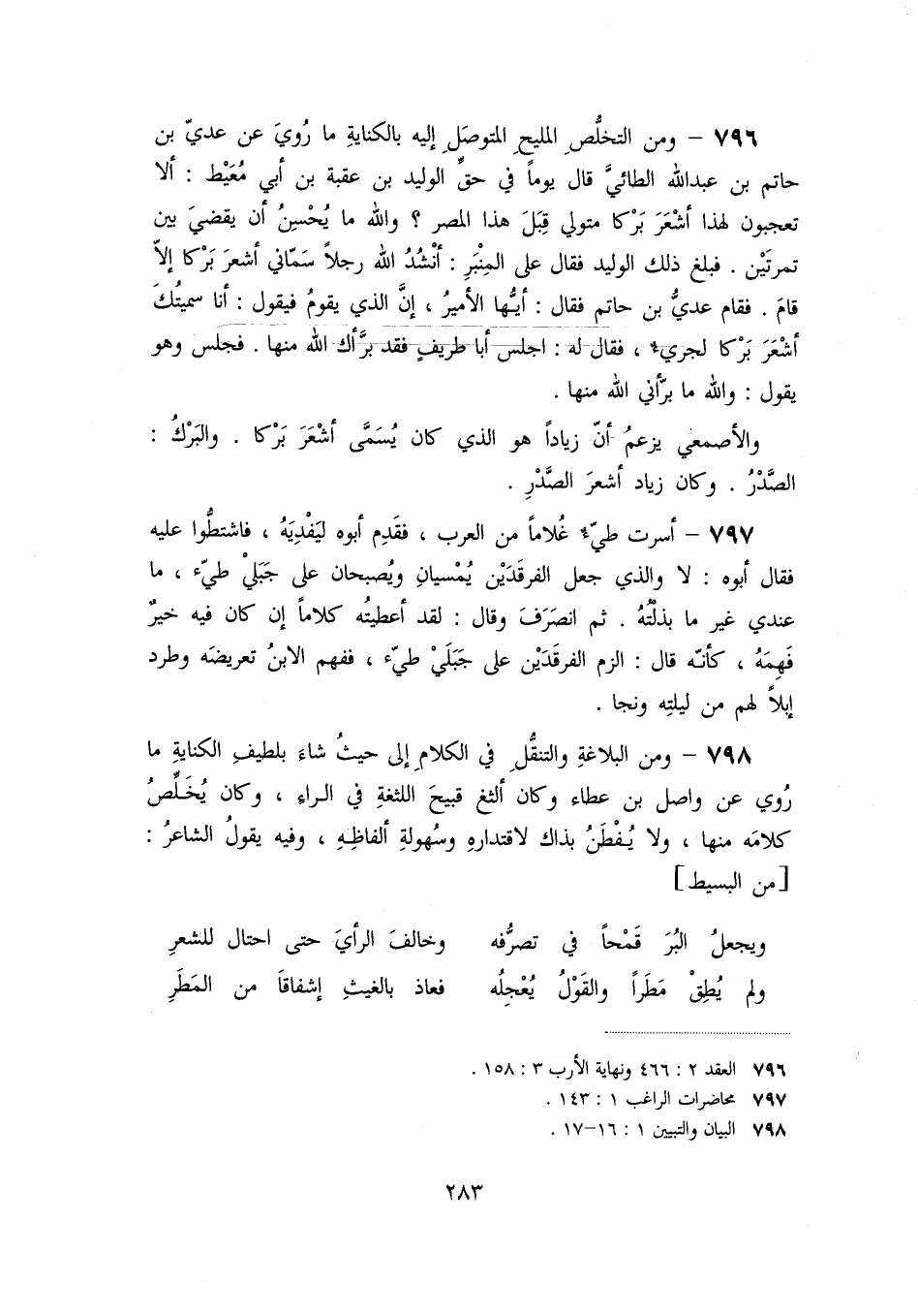 «796» - ومن التخلّص المليح المتوصل إليه بالكناية ما روي عن عديّ بن حاتم بن عبد الله الطائيّ قال يوما في حقّ الوليد بن عقبة بن أبي معيط: ألا تعجبون لهذا أشعر بركا متولي قبل هذا المصر؟ والله ما يحسن أن يقضي بين تمرتين. فبلغ ذلك الوليد فقال على المنبر: أنشد الله رجلا سمّاني أشعر بركا إلّا قام. فقام عديّ بن حاتم فقال: أيّها الأمير، إنّ الذي يقوم فيقول: أنا سميتك أشعر بركا لجريء، فقال له: اجلس أبا طريف فقد برّأك الله منها. فجلس وهو يقول: والله ما برّأني الله منها.