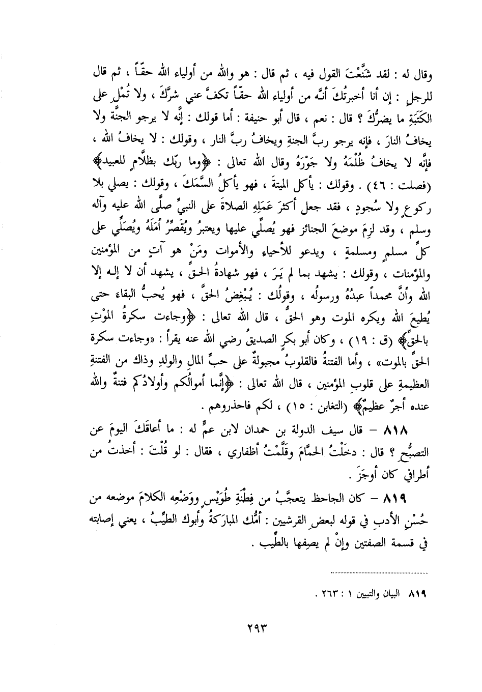 «819» - كان الجاحظ يتعجّب من فطنة طويس ووضعه الكلام موضعه من حسن الأدب في قوله لبعض القرشيين: أمّك المباركة وأبوك الطيّب، يعني إصابته في قسمة الصفتين وإن لم يصفها بالطّيب.