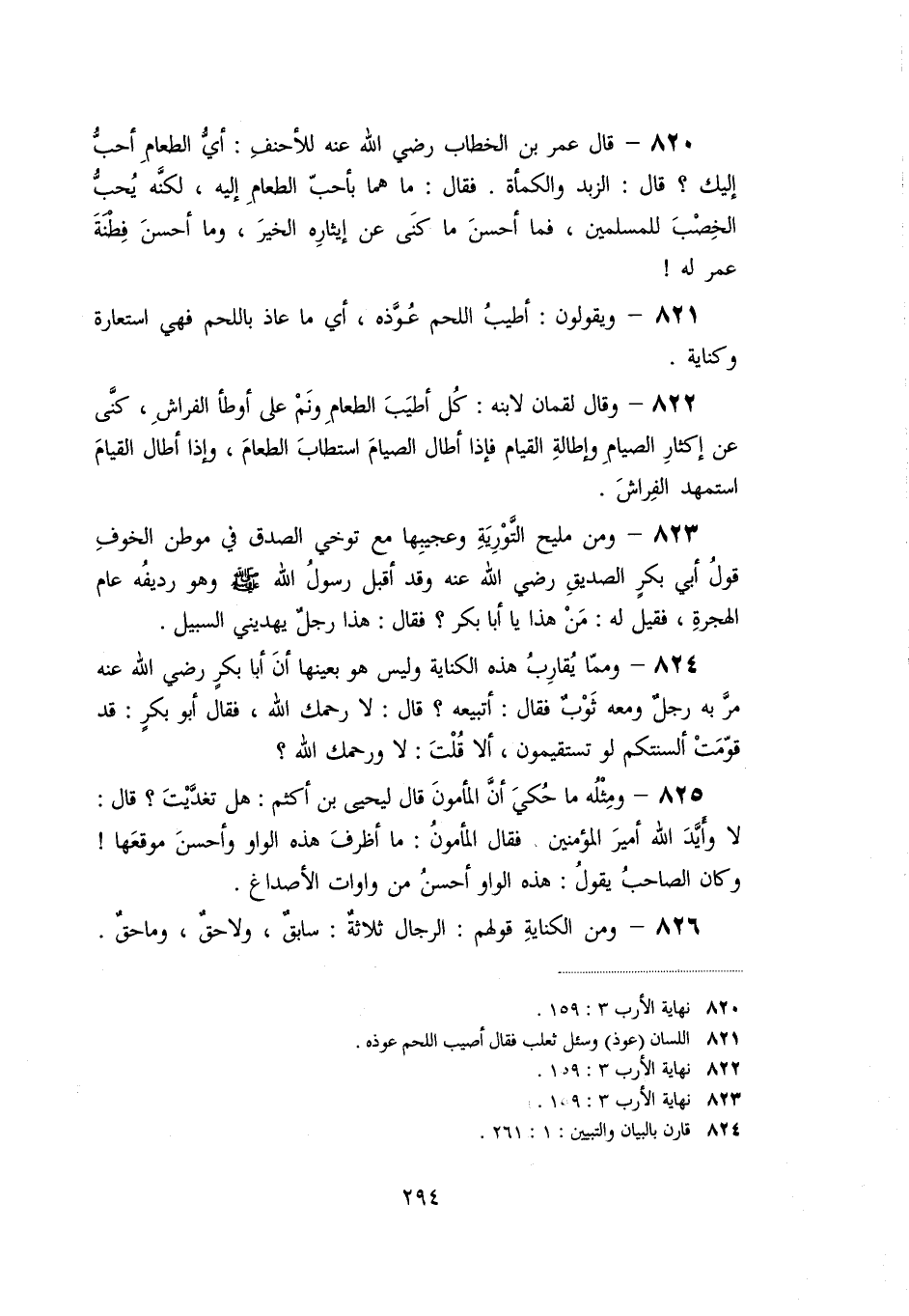«820» - قال عمر بن الخطاب رضي الله عنه للأحنف: أيّ الطعام أحبّ إليك؟ قال: الزبد والكمأة. فقال: ما هما بأحبّ الطعام إليه، لكنّه يحبّ الخصب للمسلمين، فما أحسن ما كنى عن إيثاره الخير، وما أحسن فطنة عمر له! «821» - ويقولون: أطيب اللحم عوّذه، أي ما عاذ باللحم فهي استعارة وكناية.