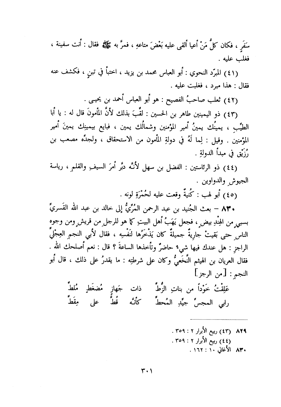 «830» - بعث الجنيد بن عبد الرحمن المرّيّ إلى خالد بن عبد الله القسريّ بسبي من الهند بيض، فجعل يهب أهل البيت كما هو للرجل من قريش ومن وجوه الناس حتى بقيت جارية جميلة كان يذخرها لنفسه، فقال لأبي النجم العجليّ الراجز: هل عندك فيها شيء حاضر وتأخذها الساعة؟ قال: نعم أصلحك الله.