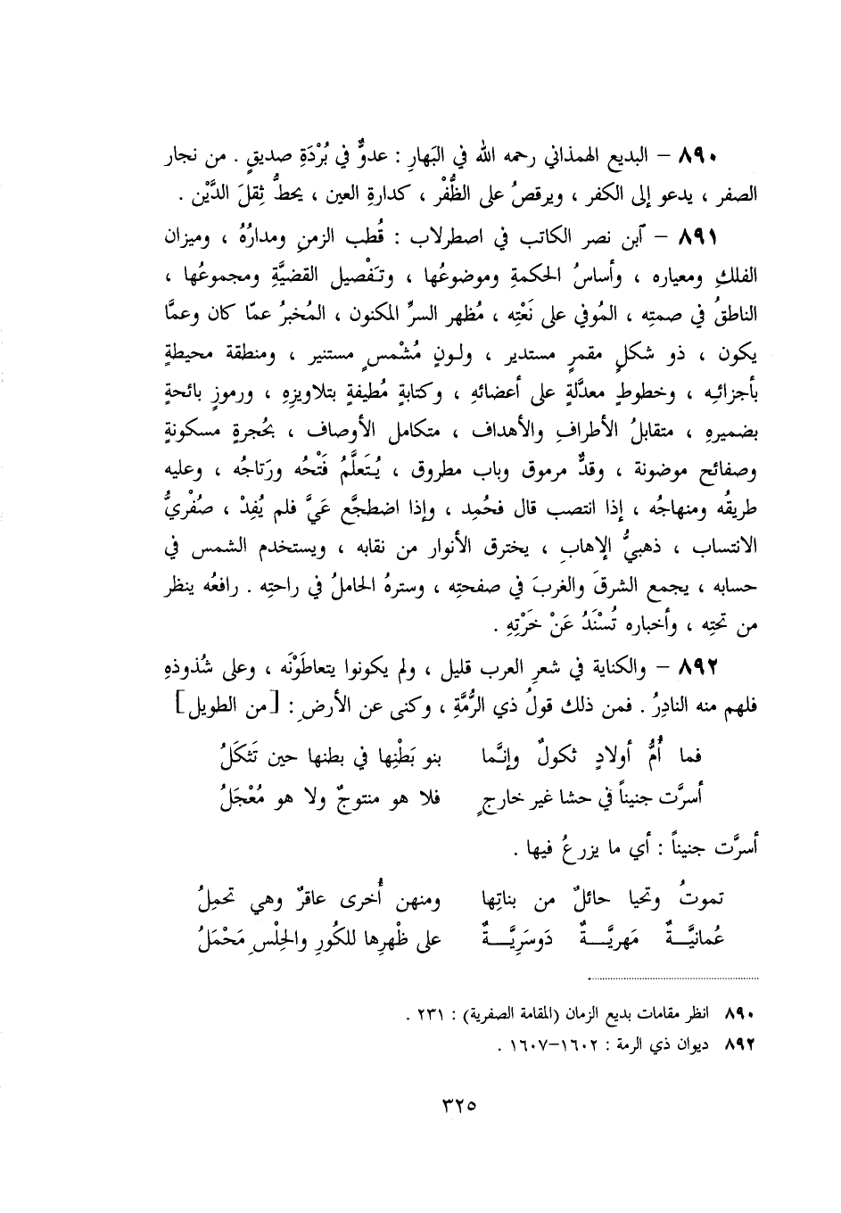 «892» - والكناية في شعر العرب قليل، ولم يكونوا يتعاطونه، وعلى شذوذه فلهم منه النادر. فمن ذلك قول ذي الرّمّة، وكنى عن الأرض: [من الطويل]