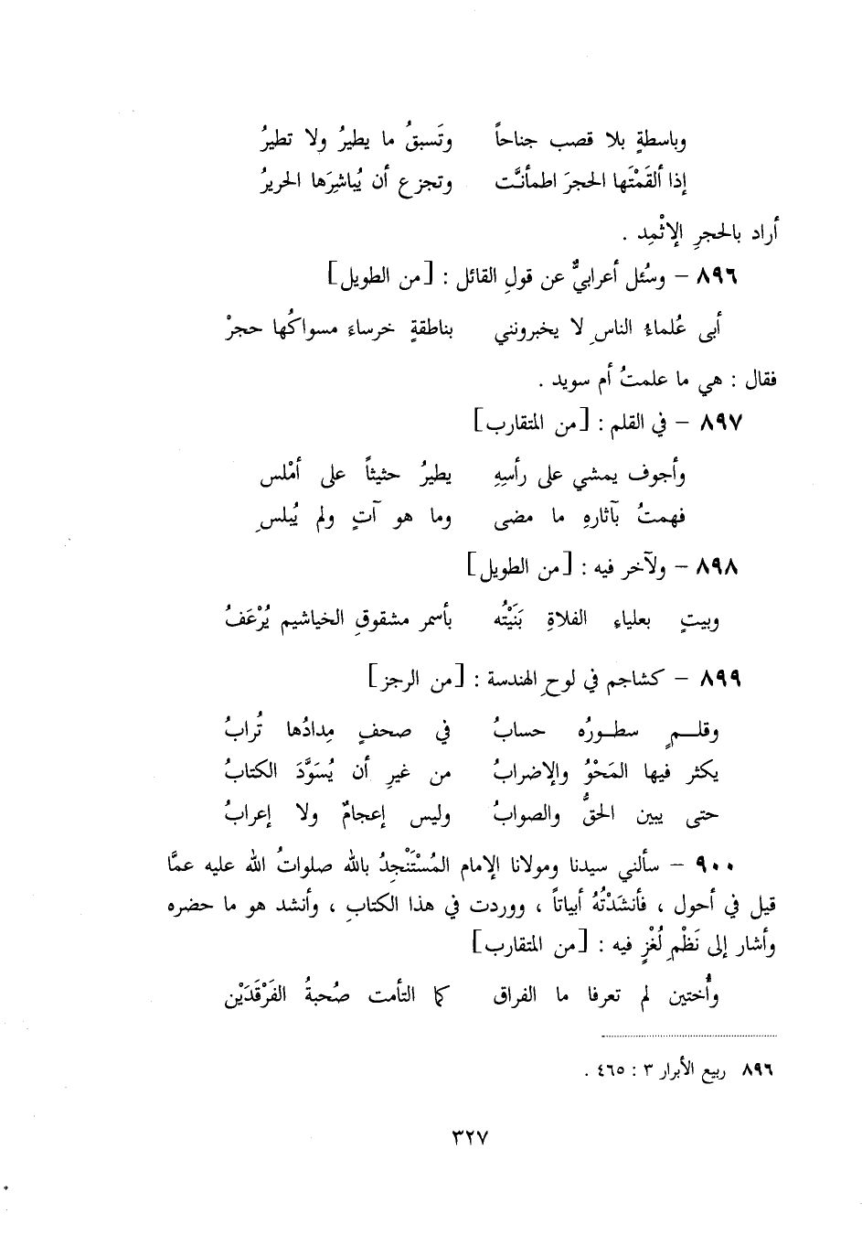 900- سألني سيدنا ومولانا الإمام المستنجد بالله صلوات الله عليه عمّا قيل في أحول، فأنشدته أبياتا، ووردت في هذا الكتاب، وأنشد هو ما حضره وأشار إلى نظم لغز فيه: [من المتقارب]