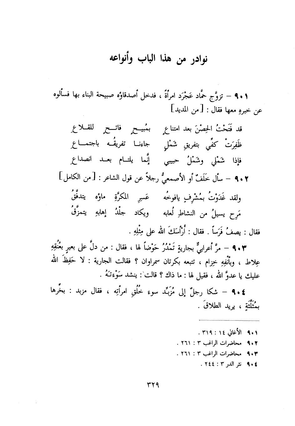 «901» - تزوّج حمّاد عجرد امرأة، فدخل أصدقاؤه صبيحة البناء بها فسألوه عن خبره معها فقال: [من المديد]