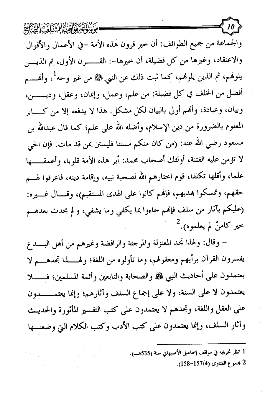 والجماعة من جميع الطوائف: أن خير قرون هذه الأمة -في الأعمال والأقوال والاعتقاد، وغيرها من كل فضيلة، أن خيرها-: القرن الأول، ثم الذين يلونهم، ثم الذين يلونهم، كما ثبت ذلك عن النبي - صلى الله عليه وسلم - من غير وجه (¬1)، وأنهم أفضل من الخلف في كل فضيلة: من علم، وعمل، وإيمان، وعقل، ودين، وبيان، وعبادة، وأنهم أولى بالبيان لكل مشكل. هذا لا يدفعه إلا من كابر المعلوم بالضرورة من دين الإسلام، وأضله الله على علم؛ كما قال عبد الله بن مسعود رضي الله عنه: (من كان منكم مستنا فليستن بمن قد مات. فإن الحي لا تؤمن عليه الفتنة، أولئك أصحاب محمد: أبر هذه الأمة قلوبا، وأعمقها علما، وأقلها تكلفا، قوم اختارهم الله لصحبة نبيه، وإقامة دينه، فاعرفوا لهم حقهم، وتمسكوا بهديهم، فإنهم كانوا على الهدى المستقيم)، وقال غيره: (عليكم بآثار من سلف فإنهم جاءوا بما يكفي وما يشفي، ولم يحدث بعدهم خير كامنٌ لم يعلموه). (¬2)