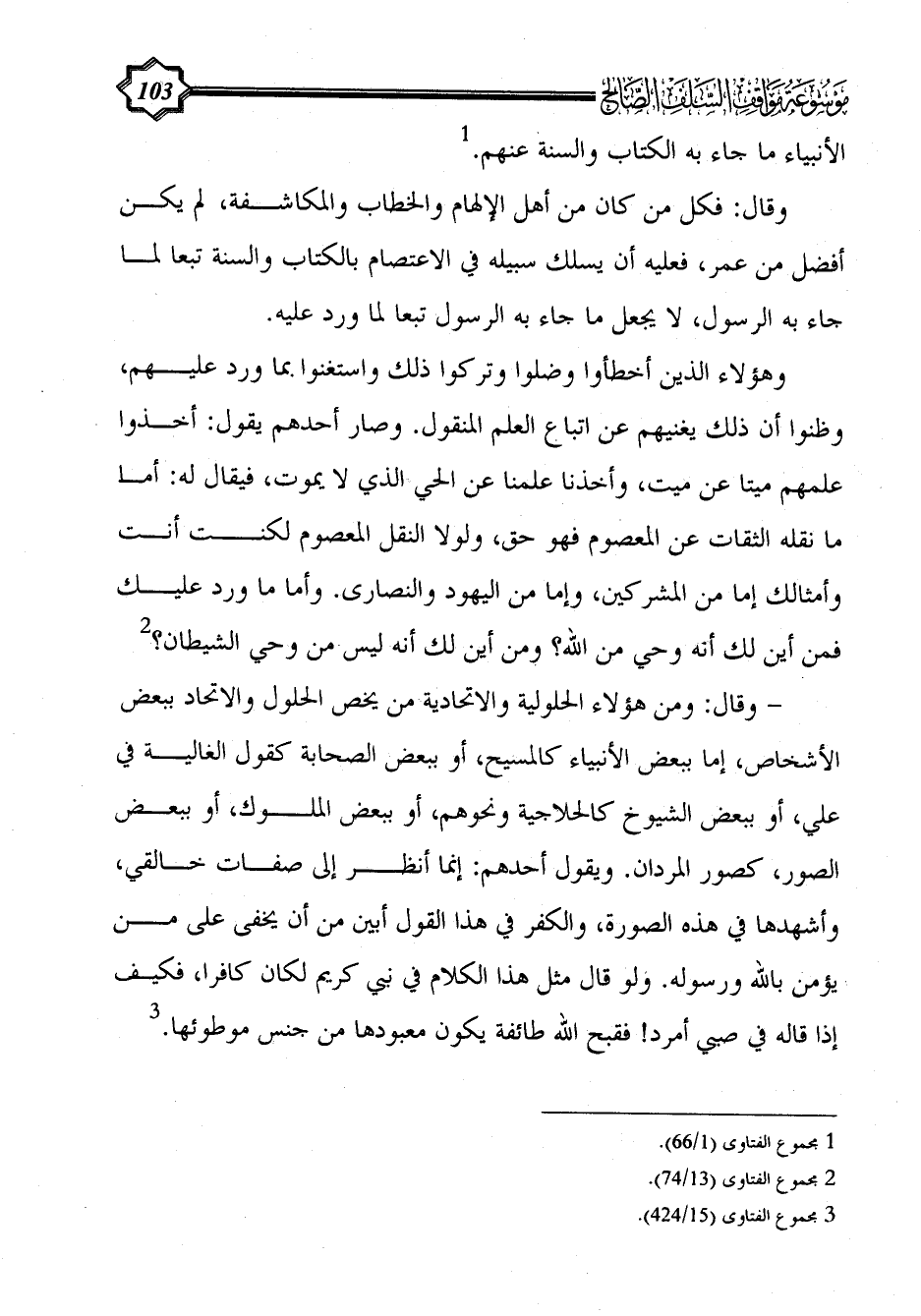 وهؤلاء الذين أخطأوا وضلوا وتركوا ذلك واستغنوا بما ورد عليهم، وظنوا أن ذلك يغنيهم عن اتباع العلم المنقول. وصار أحدهم يقول: أخذوا علمهم ميتا عن ميت، وأخذنا علمنا عن الحي الذي لا يموت، فيقال له: أما ما نقله الثقات عن المعصوم فهو حق، ولولا النقل المعصوم لكنت أنت وأمثالك إما من المشركين، وإما من اليهود والنصارى. وأما ما ورد عليك فمن أين لك أنه وحي من الله؟ ومن أين لك أنه ليس من وحي الشيطان؟ (¬2)