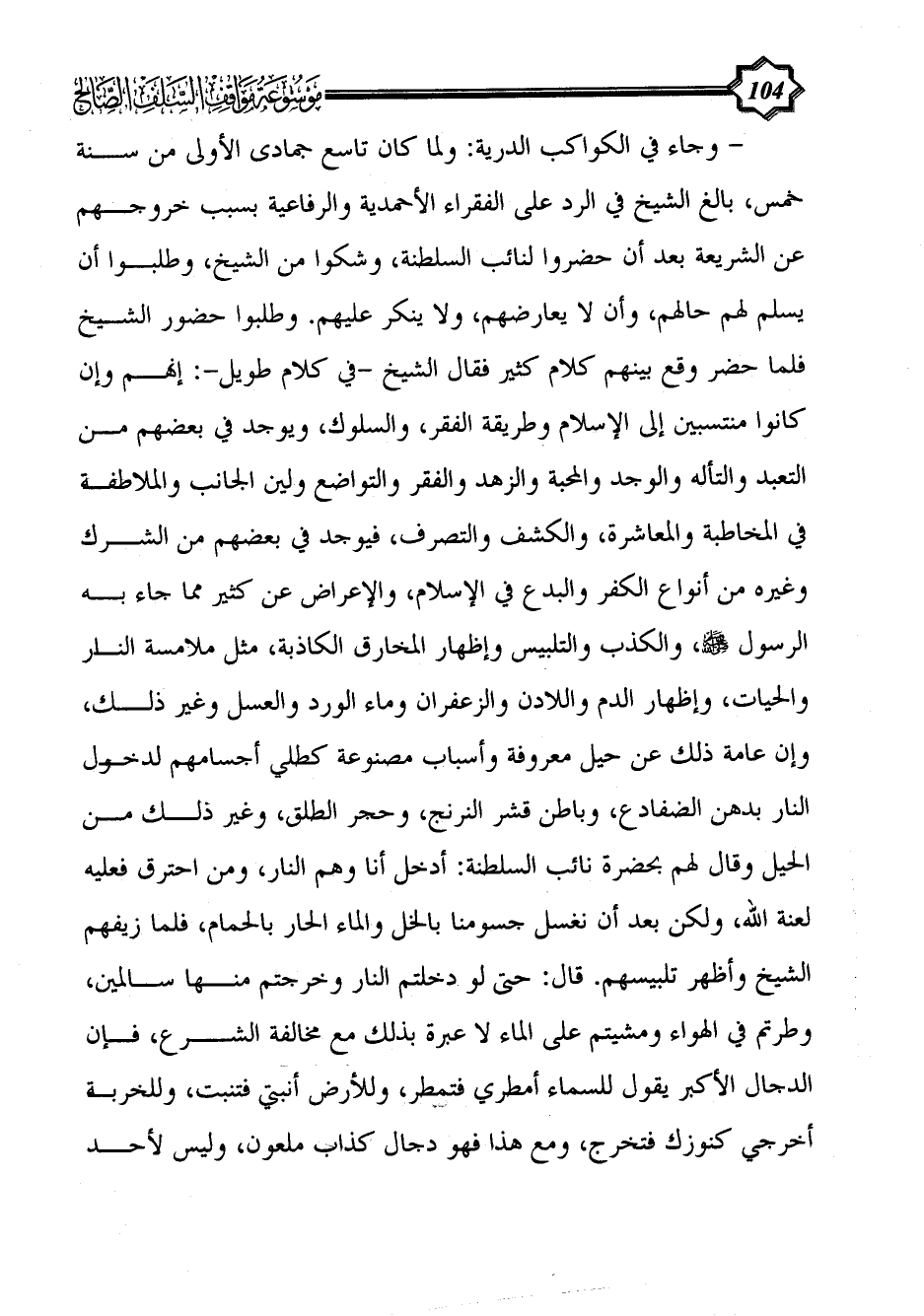 - وجاء في الكواكب الدرية: ولما كان تاسع جمادى الأولى من سنة خمس، بالغ الشيخ في الرد على الفقراء الأحمدية والرفاعية بسبب خروجهم عن الشريعة بعد أن حضروا لنائب السلطنة، وشكوا من الشيخ، وطلبوا أن يسلم لهم حالهم، وأن لا يعارضهم، ولا ينكر عليهم. وطلبوا حضور الشيخ فلما حضر وقع بينهم كلام كثير فقال الشيخ -في كلام طويل-: إنهم وإن كانوا منتسبين إلى الإسلام وطريقة الفقر، والسلوك، ويوجد في بعضهم من التعبد والتأله والوجد والمحبة والزهد والفقر والتواضع ولين الجانب والملاطفة في المخاطبة والمعاشرة، والكشف والتصرف، فيوجد في بعضهم من الشرك وغيره من أنواع الكفر والبدع في الإسلام، والإعراض عن كثير مما جاء به الرسول - صلى الله عليه وسلم -، والكذب والتلبيس وإظهار المخارق الكاذبة، مثل ملامسة النار والحيات، وإظهار الدم واللادن والزعفران وماء الورد والعسل وغير ذلك، وإن عامة ذلك عن حيل معروفة وأسباب مصنوعة كطلي أجسامهم لدخول النار بدهن الضفادع، وباطن قشر النرنج، وحجر الطلق، وغير ذلك من الحيل وقال لهم بحضرة نائب السلطنة: أدخل أنا وهم النار، ومن احترق فعليه لعنة الله، ولكن بعد أن نغسل جسومنا بالخل والماء الحار بالحمام، فلما زيفهم الشيخ وأظهر تلبيسهم. قال: حتى لو دخلتم النار وخرجتم منها سالمين، وطرتم في الهواء ومشيتم على الماء لا عبرة بذلك مع مخالفة الشرع، فإن الدجال الأكبر يقول للسماء أمطري فتمطر، وللأرض أنبتي فتنبت، وللخربة أخرجي كنوزك فتخرج، ومع هذا فهو دجال كذاب ملعون، وليس لأحد