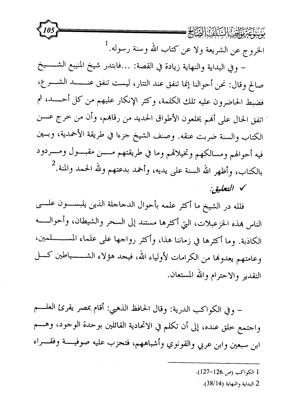 - وفي البداية والنهاية زيادة في القصة: ... فابتدر شيخ المنيبع الشيخ صالح وقال: نحن أحوالنا إنما تنفق عند التتار، ليست تنفق عند الشرع، فضبط الحاضرون عليه تلك الكلمة، وكثر الإنكار عليهم من كل أحد، ثم اتفق الحال على أنهم يخلعون الأطواق الحديد من رقابهم، وأن من خرج عن الكتاب والسنة ضربت عنقه. وصنف الشيخ جزءا في طريقة الأحمدية، وبين فيه أحوالهم ومسالكهم وتخيلاتهم وما في طريقتهم من مقبول ومردود بالكتاب، وأظهر الله السنة على يديه، وأخمد بدعتهم ولله الحمد والمنة. (¬2)