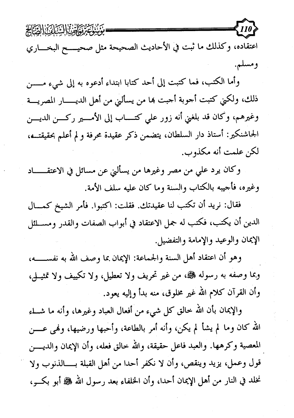 وكان يرد علي من مصر وغيرها من يسألني عن مسائل في الاعتقاد وغيره، فأجيبه بالكتاب والسنة وما كان عليه سلف الأمة.