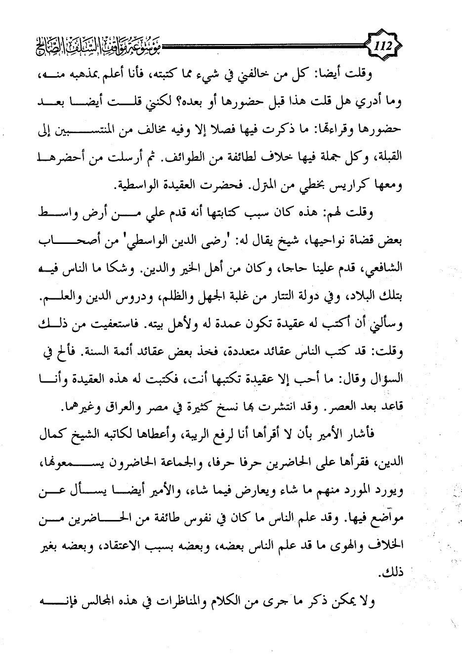 وقلت أيضا: كل من خالفني في شيء مما كتبته، فأنا أعلم بمذهبه منه، وما أدري هل قلت هذا قبل حضورها أو بعده؟ لكنني قلت أيضا بعد حضورها وقراءتها: ما ذكرت فيها فصلا إلا وفيه مخالف من المنتسبين إلى القبلة، وكل جملة فيها خلاف لطائفة من الطوائف. ثم أرسلت من أحضرها ومعها كراريس بخطي من المنزل. فحضرت العقيدة الواسطية.