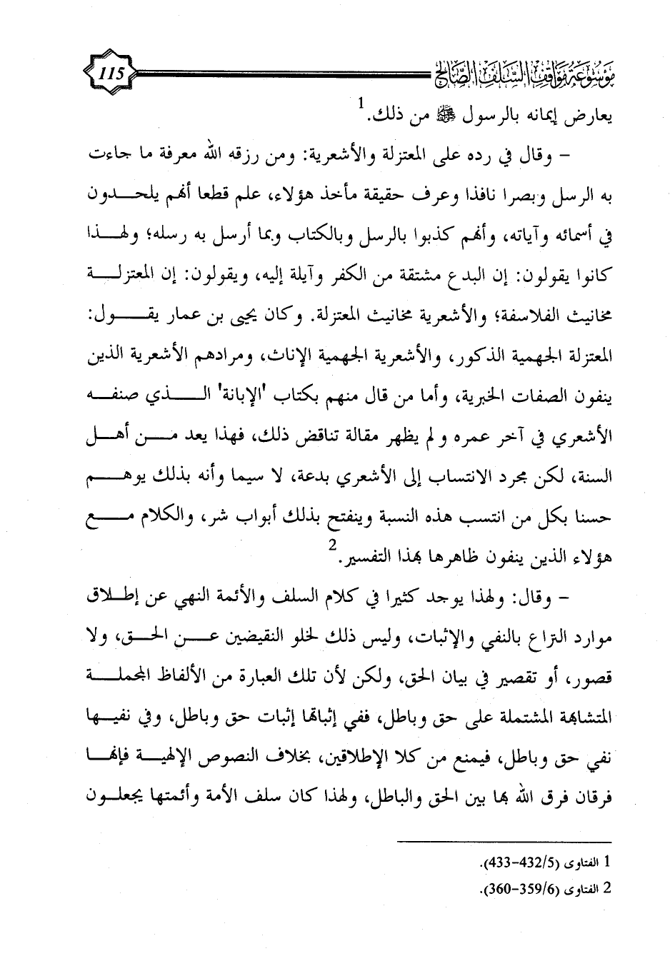 - وقال: ولهذا يوجد كثيرا في كلام السلف والأئمة النهي عن إطلاق موارد النزاع بالنفي والإثبات، وليس ذلك لخلو النقيضين عن الحق، ولا قصور، أو تقصير في بيان الحق، ولكن لأن تلك العبارة من الألفاظ المجملة المتشابهة المشتملة على حق وباطل، ففي إثباتها إثبات حق وباطل، وفي نفيها نفي حق وباطل، فيمنع من كلا الإطلاقين، بخلاف النصوص الإلهية فإنها فرقان فرق الله بها بين الحق والباطل، ولهذا كان سلف الأمة وأئمتها يجعلون