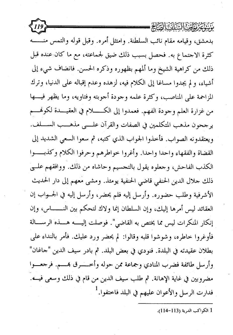بدمشق، وقيامه مقام نائب السلطنة. وامتثل أمره. وقبل قوله والتمس منه كثرة الاجتماع به. فحصل بسبب ذلك ضيق لجماعته، مع ما كان عنده قبل ذلك من كراهية الشيخ وما ألمهم بظهوره وذكره الحسن. فانضاف شيء إلى أشياء، ولم يجدوا مساغا إلى الكلام فيه، لزهده وعدم إقباله على الدنيا، وترك المزاحمة على المناصب، وكثرة علمه وجودة أجوبته وفتاويه، وما يظهر فيها من غزارة العلم وجودة الفهم. فعمدوا إلى الكلام في العقيدة لكونهم يرجحون مذهب المتكلمين في الصفات والقرآن على مذهب السلف. ويعتقدونه الصواب. فأخذوا الجواب الذي كتبه، ثم سعوا السعي الشديد إلى القضاة والفقهاء واحدا واحدا. وأغروا خواطرهم وحرفوا الكلام وكذبوا الكذب الفاحش، وجعلوه يقول بالتجسيم وحاشاه من ذلك. ووافقهم على ذلك جلال الدين الحنفي قاضي الحنفية يومئذ. ومشى معهم إلى دار الحديث الأشرفية وطلب حضوره. وأرسل إليه فلم يحضر، وأرسل إليه في الجواب إن العقائد ليس أمرها إليك، وإن السلطان إنما ولاك لتحكم بين الناس، وإن إنكار المنكرات ليس مما يختص به القاضي". فوصلت إليه هذه الرسالة فأوغروا خاطره، وشوشوا قلبه وقالوا: لم يحضر ورد عليك. فأمر بالنداء على بطلان عقيدته في البلدة. فنودي في بعض البلد. ثم بادر سيف الدين "جاغان" وأرسل طائفة فضرب المنادي وجماعة ممن حوله وأخرق بهم. فرجعوا مضروبين في غاية الإهانة. ثم طلب سيف الدين من قام في ذلك وسعى فيه. فدارت الرسل والأعوان عليهم في البلد فاختفوا. (¬1)