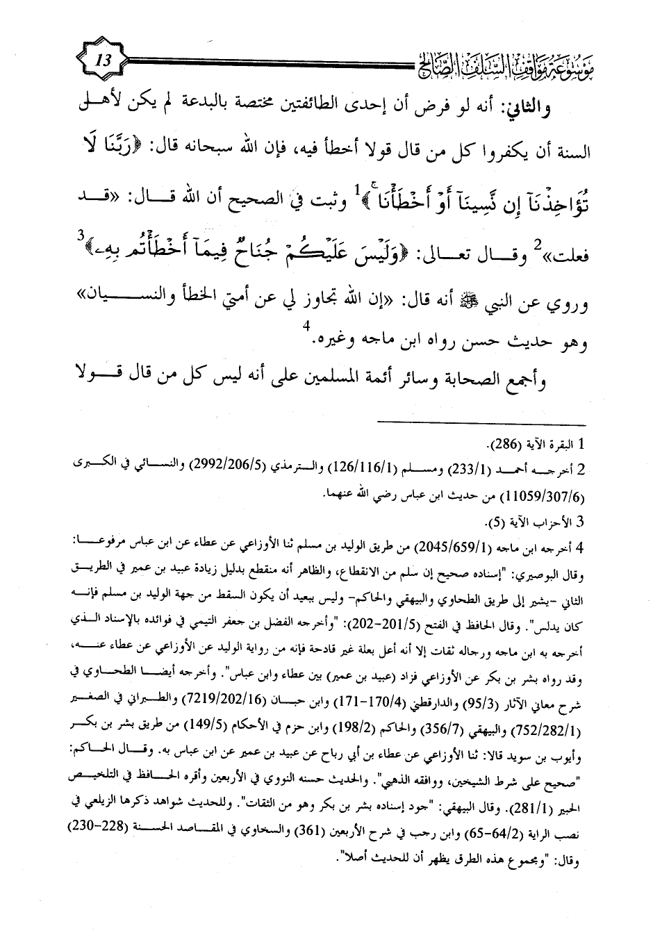 والثاني: أنه لو فرض أن إحدى الطائفتين مختصة بالبدعة لم يكن لأهل السنة أن يكفروا كل من قال قولا أخطأ فيه، فإن الله سبحانه قال: {رَبَّنَا لَا تُؤَاخِذْنَا إِنْ نَسِينَا أَوْ أَخْطَأْنَا} (¬1) وثبت في الصحيح أن الله قال: «قد فعلت» (¬2) وقال تعالى: {وَلَيْسَ عَلَيْكُمْ جُنَاحٌ فِيمَا أَخْطَأْتُمْ بِهِ} (¬3) وروي عن النبي - صلى الله عليه وسلم - أنه قال: «إن الله تجاوز لي عن أمتي الخطأ والنسيان» وهو حديث حسن رواه ابن ماجه وغيره. (¬4)