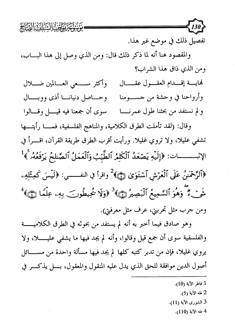 وقال: (لقد تأملت الطرق الكلامية، والمناهج الفلسفية، فما رأيتها تشفي عليلا، ولا تروي غليلا. ورأيت أقرب الطرق طريقة القرآن، اقرأ في الإثبات: {إِلَيْهِ يَصْعَدُ الْكَلِمُ الطَّيِّبُ وَالْعَمَلُ الصَّالِحُ يَرْفَعُهُ} (¬1) {الرَّحْمَنُ عَلَى الْعَرْشِ اسْتَوَى (5)} (¬2) واقرأ في النفي: {لَيْسَ كَمِثْلِهِ شَيْءٌ وَهُوَ السَّمِيعُ الْبَصِيرُ (11)} (¬3) {وَلَا يُحِيطُونَ بِهِ عِلْمًا (110)} (¬4) ومن جرب مثل تجربتي، عرف مثل معرفتي).