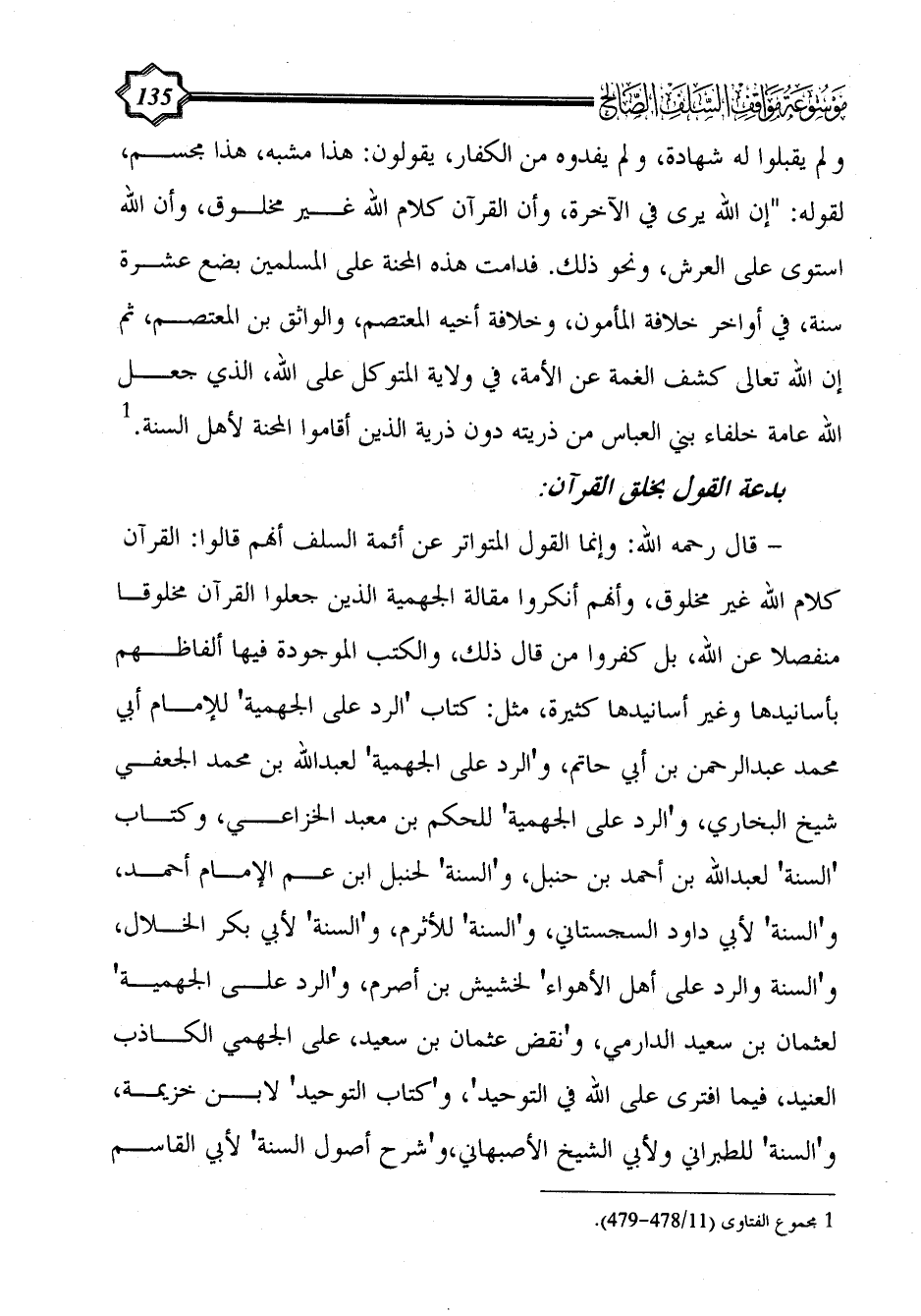 - قال رحمه الله: وإنما القول المتواتر عن أئمة السلف أنهم قالوا: القرآن كلام الله غير مخلوق، وأنهم أنكروا مقالة الجهمية الذين جعلوا القرآن مخلوقا منفصلا عن الله، بل كفروا من قال ذلك، والكتب الموجودة فيها ألفاظهم بأسانيدها وغير أسانيدها كثيرة، مثل: كتاب 'الرد على الجهمية' للإمام أبي محمد عبد الرحمن بن أبي حاتم، و'الرد على الجهمية' لعبد الله بن محمد الجعفي شيخ البخاري، و'الرد على الجهمية' للحكم بن معبد الخزاعي، وكتاب 'السنة' لعبد الله بن أحمد بن حنبل، و'السنة' لحنبل ابن عم الإمام أحمد، و'السنة' لأبي داود السجستاني، و'السنة' للأثرم، و'السنة' لأبي بكر الخلال، و'السنة والرد على أهل الأهواء' لخشيش بن أصرم، و'الرد على الجهمية' لعثمان بن سعيد الدارمي، و'نقض عثمان بن سعيد، على الجهمي الكاذب العنيد، فيما افترى على الله في التوحيد'، و'كتاب التوحيد' لابن خزيمة، و'السنة' للطبراني ولأبي الشيخ الأصبهاني، و'شرح أصول السنة' لأبي القاسم