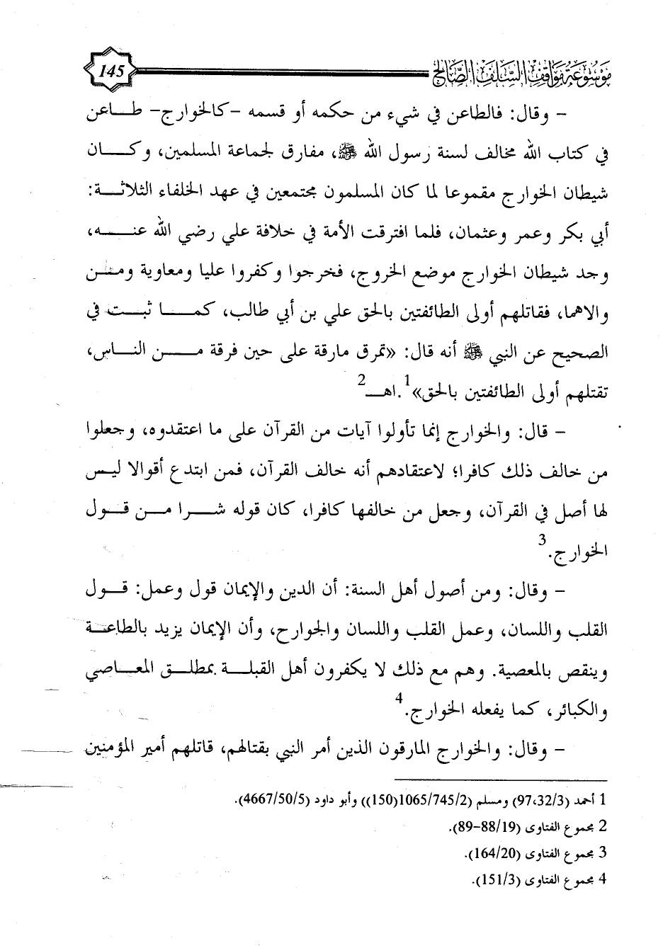 - وقال: والخوارج المارقون الذين أمر النبي بقتالهم، قاتلهم أمير المؤمنين