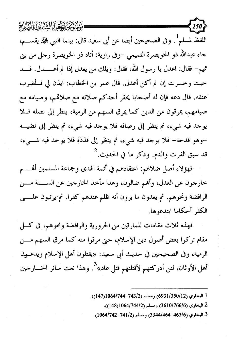 فهذه ثلاث مقامات للمارقين من الحرورية والرافضة ونحوهم، فى كل مقام تركوا بعض أصول دين الإسلام، حتى مرقوا منه كما مرق السهم من الرمية، وفى الصحيحين في حديث أبى سعيد: «يقتلون أهل الإسلام ويدعون أهل الأوثان، لئن أدركتهم لأقتلنهم قتل عاد» (¬3). وهذا نعت سائر الخارجين