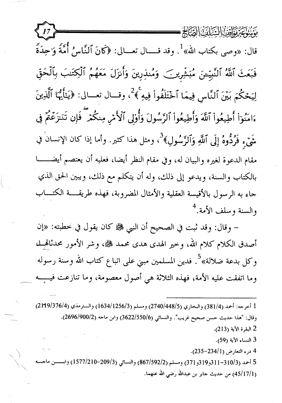 وقد قال تعالى: {كَانَ النَّاسُ أُمَّةً وَاحِدَةً فَبَعَثَ اللَّهُ النَّبِيِّينَ مُبَشِّرِينَ وَمُنْذِرِينَ وَأَنْزَلَ مَعَهُمُ الْكِتَابَ بِالْحَقِّ لِيَحْكُمَ بَيْنَ النَّاسِ فِيمَا اخْتَلَفُوا فِيهِ} (¬2)، وقال تعالى: {يَا أَيُّهَا الَّذِينَ آَمَنُوا أَطِيعُوا اللَّهَ وَأَطِيعُوا الرَّسُولَ وَأُولِي الْأَمْرِ مِنْكُمْ فَإِنْ تَنَازَعْتُمْ فِي شَيْءٍ فَرُدُّوهُ إِلَى اللَّهِ وَالرَّسُولِ} (¬3)، ومثل هذا كثير. وأما إذا كان الإنسان في مقام الدعوة لغيره والبيان له، وفي مقام النظر أيضا، فعليه أن يعتصم أيضا بالكتاب والسنة، ويدعو إلى ذلك، وله أن يتكلم مع ذلك، ويبين الحق الذي جاء به الرسول بالأقيسة العقلية والأمثال المضروبة، فهذه طريقة الكتاب والسنة وسلف الأمة. (¬4)