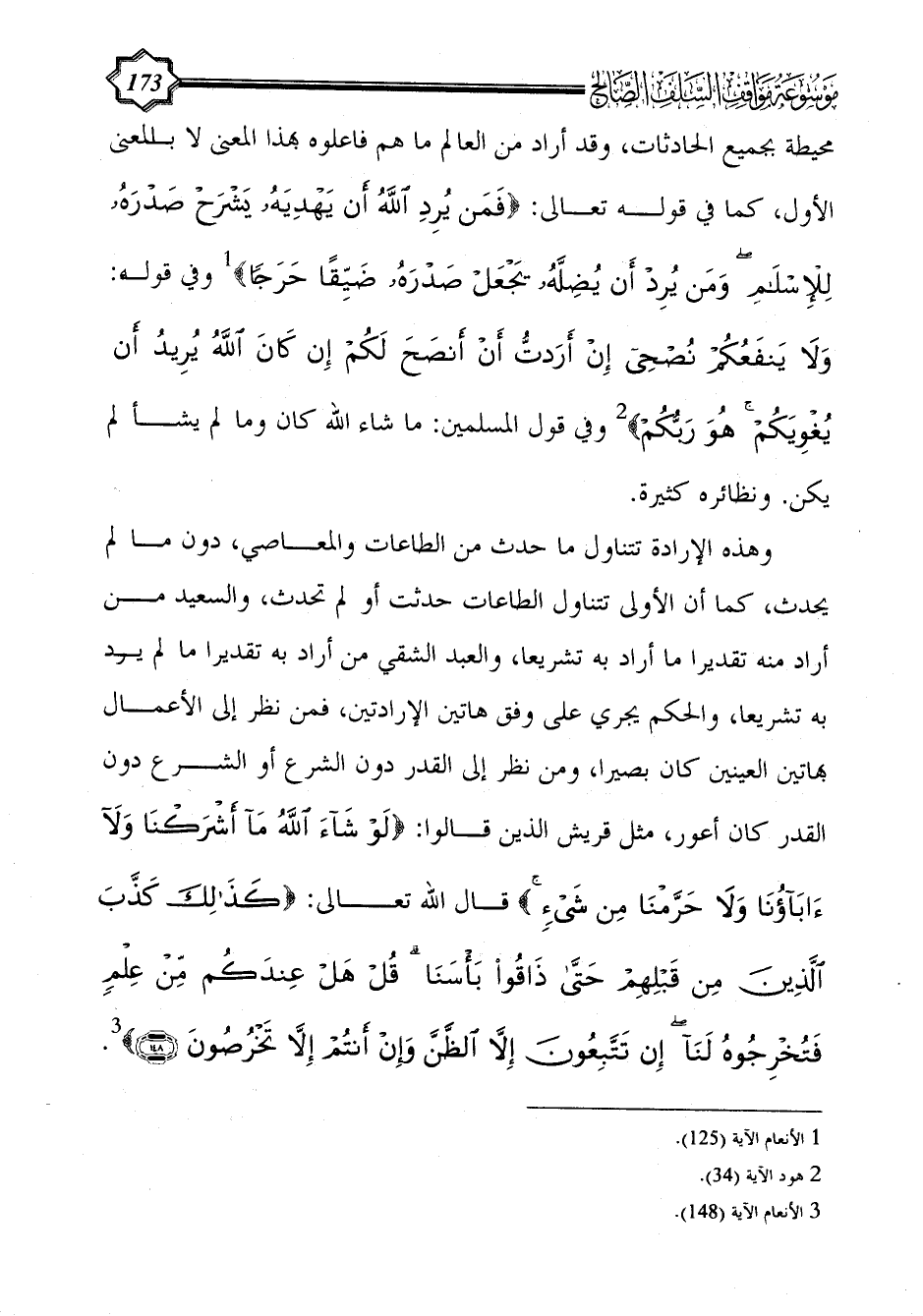 وهذه الإرادة تتناول ما حدث من الطاعات والمعاصي، دون ما لم يحدث، كما أن الأولى تتناول الطاعات حدثت أو لم تحدث، والسعيد من أراد منه تقديرا ما أراد به تشريعا، والعبد الشقي من أراد به تقديرا ما لم يرد به تشريعا، والحكم يجري على وفق هاتين الإرادتين، فمن نظر إلى الأعمال بهاتين العينين كان بصيرا، ومن نظر إلى القدر دون الشرع أو الشرع دون القدر كان أعور، مثل قريش الذين قالوا: {لَوْ شَاءَ اللَّهُ مَا أَشْرَكْنَا وَلَا آَبَاؤُنَا وَلَا حَرَّمْنَا مِنْ شَيْءٍ} قال الله تعالى: {كَذَلِكَ كَذَّبَ الَّذِينَ مِنْ قَبْلِهِمْ حَتَّى ذَاقُوا بَأْسَنَا قُلْ هَلْ عِنْدَكُمْ مِنْ عِلْمٍ فَتُخْرِجُوهُ لَنَا إِنْ تَتَّبِعُونَ إِلَّا الظَّنَّ وَإِنْ أَنْتُمْ إِلَّا تَخْرُصُونَ (148)} (¬3).