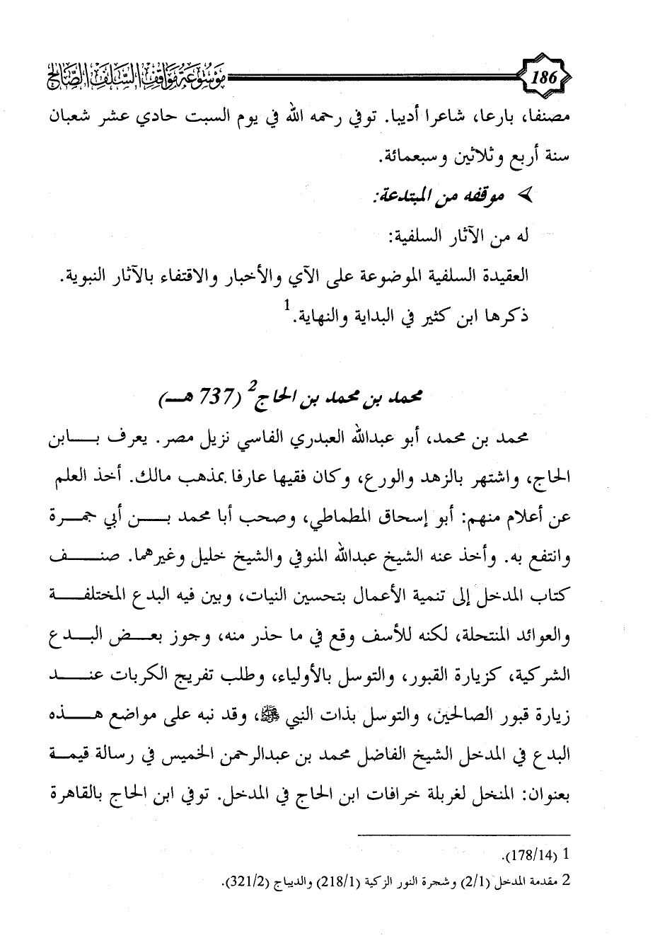 محمد بن محمد، أبو عبد الله العبدري الفاسي نزيل مصر. يعرف بابن الحاج، واشتهر بالزهد والورع، وكان فقيها عارفا بمذهب مالك. أخذ العلم عن أعلام منهم: أبو إسحاق المطماطي، وصحب أبا محمد بن أبي جمرة وانتفع به. وأخذ عنه الشيخ عبد الله المنوفي والشيخ خليل وغيرهما. صنف كتاب المدخل إلى تنمية الأعمال بتحسين النيات، وبين فيه البدع المختلفة والعوائد المنتحلة، لكنه للأسف وقع في ما حذر منه، وجوز بعض البدع الشركية، كزيارة القبور، والتوسل بالأولياء، وطلب تفريج الكربات عند زيارة قبور الصالحين، والتوسل بذات النبي - صلى الله عليه وسلم -، وقد نبه على مواضع هذه البدع في المدخل الشيخ الفاضل محمد بن عبد الرحمن الخميس في رسالة قيمة بعنوان: المنخل لغربلة خرافات ابن الحاج في المدخل. توفي ابن الحاج بالقاهرة