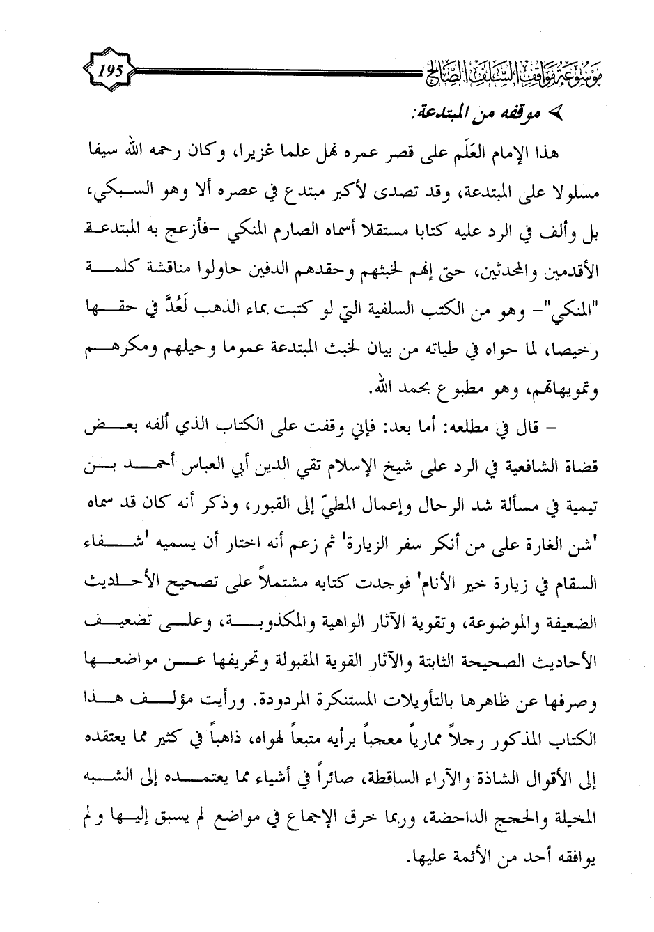 - قال في مطلعه: أما بعد: فإني وقفت على الكتاب الذي ألفه بعض قضاة الشافعية في الرد على شيخ الإسلام تقي الدين أبي العباس أحمد بن تيمية في مسألة شد الرحال وإعمال المطيّ إلى القبور، وذكر أنه كان قد سماه 'شن الغارة على من أنكر سفر الزيارة' ثم زعم أنه اختار أن يسميه 'شفاء السقام في زيارة خير الأنام' فوجدت كتابه مشتملاً على تصحيح الأحاديث الضعيفة والموضوعة، وتقوية الآثار الواهية والمكذوبة، وعلى تضعيف الأحاديث الصحيحة الثابتة والآثار القوية المقبولة وتحريفها عن مواضعها وصرفها عن ظاهرها بالتأويلات المستنكرة المردودة. ورأيت مؤلف هذا الكتاب المذكور رجلاً ممارياً معجباً برأيه متبعاً لهواه، ذاهباً في كثير مما يعتقده إلى الأقوال الشاذة والآراء الساقطة، صائراً في أشياء مما يعتمده إلى الشبه المخيلة والحجج الداحضة، وربما خرق الإجماع في مواضع لم يسبق إليها ولم يوافقه أحد من الأئمة عليها.