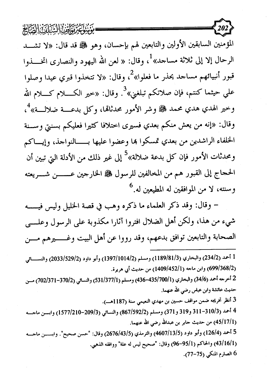إلى غير ذلك من الأدلة التي تبين أن الحجاج إلى القبور هم من المخالفين للرسول - صلى الله عليه وسلم - الخارجين عن شريعته وسنته، لا من الموافقين له المطيعين له. (¬6)