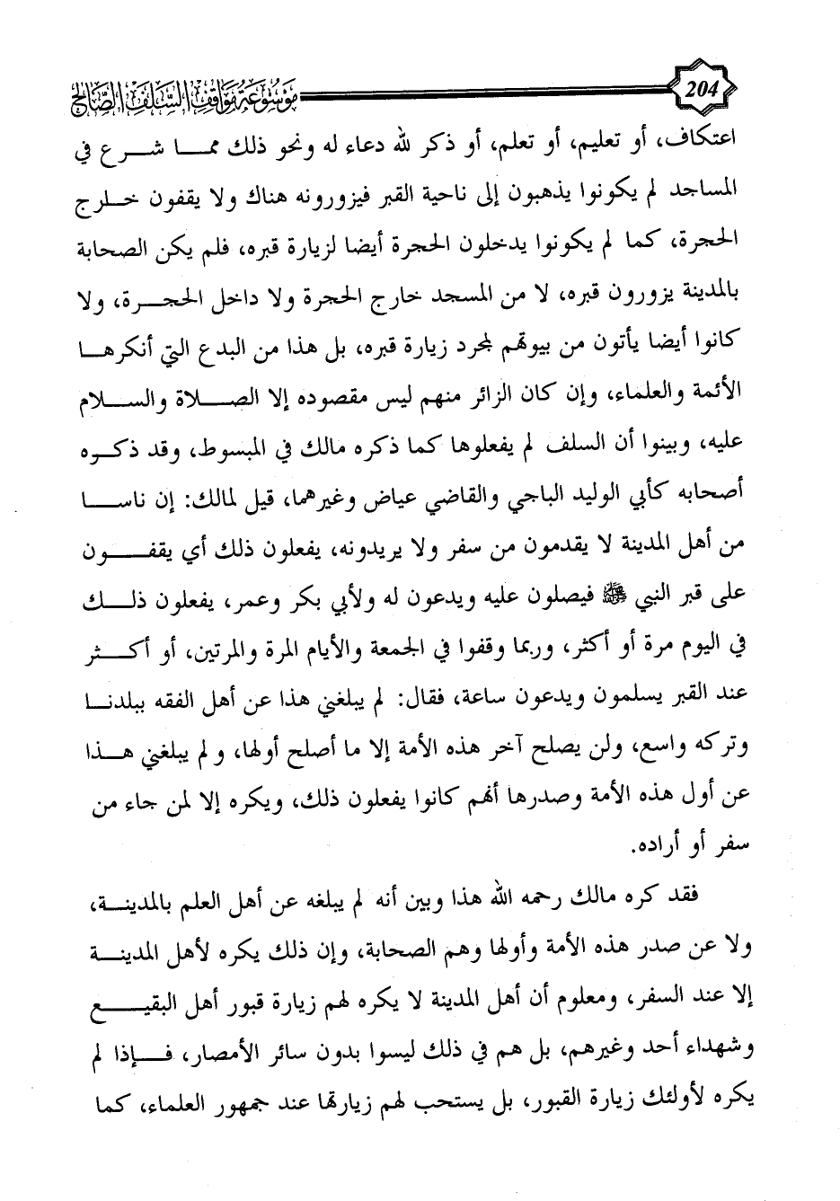 اعتكاف، أو تعليم، أو تعلم، أو ذكر لله دعاء له ونحو ذلك مما شرع في المساجد لم يكونوا يذهبون إلى ناحية القبر فيزورونه هناك ولا يقفون خارج الحجرة، كما لم يكونوا يدخلون الحجرة أيضا لزيارة قبره، فلم يكن الصحابة بالمدينة يزورون قبره، لا من المسجد خارج الحجرة ولا داخل الحجرة، ولا كانوا أيضا يأتون من بيوتهم لمجرد زيارة قبره، بل هذا من البدع التي أنكرها الأئمة والعلماء، وإن كان الزائر منهم ليس مقصوده إلا الصلاة والسلام عليه، وبينوا أن السلف لم يفعلوها كما ذكره مالك في المبسوط، وقد ذكره أصحابه كأبي الوليد الباجي والقاضي عياض وغيرهما، قيل لمالك: إن ناسا من أهل المدينة لا يقدمون من سفر ولا يريدونه، يفعلون ذلك أي يقفون على قبر النبي - صلى الله عليه وسلم - فيصلون عليه ويدعون له ولأبي بكر وعمر، يفعلون ذلك في اليوم مرة أو أكثر، وربما وقفوا في الجمعة والأيام المرة والمرتين، أو أكثر عند القبر يسلمون ويدعون ساعة، فقال: لم يبلغني هذا عن أهل الفقه ببلدنا وتركه واسع، ولن يصلح آخر هذه الأمة إلا ما أصلح أولها، ولم يبلغني هذا عن أول هذه الأمة وصدرها أنهم كانوا يفعلون ذلك، ويكره إلا لمن جاء من سفر أو أراده.