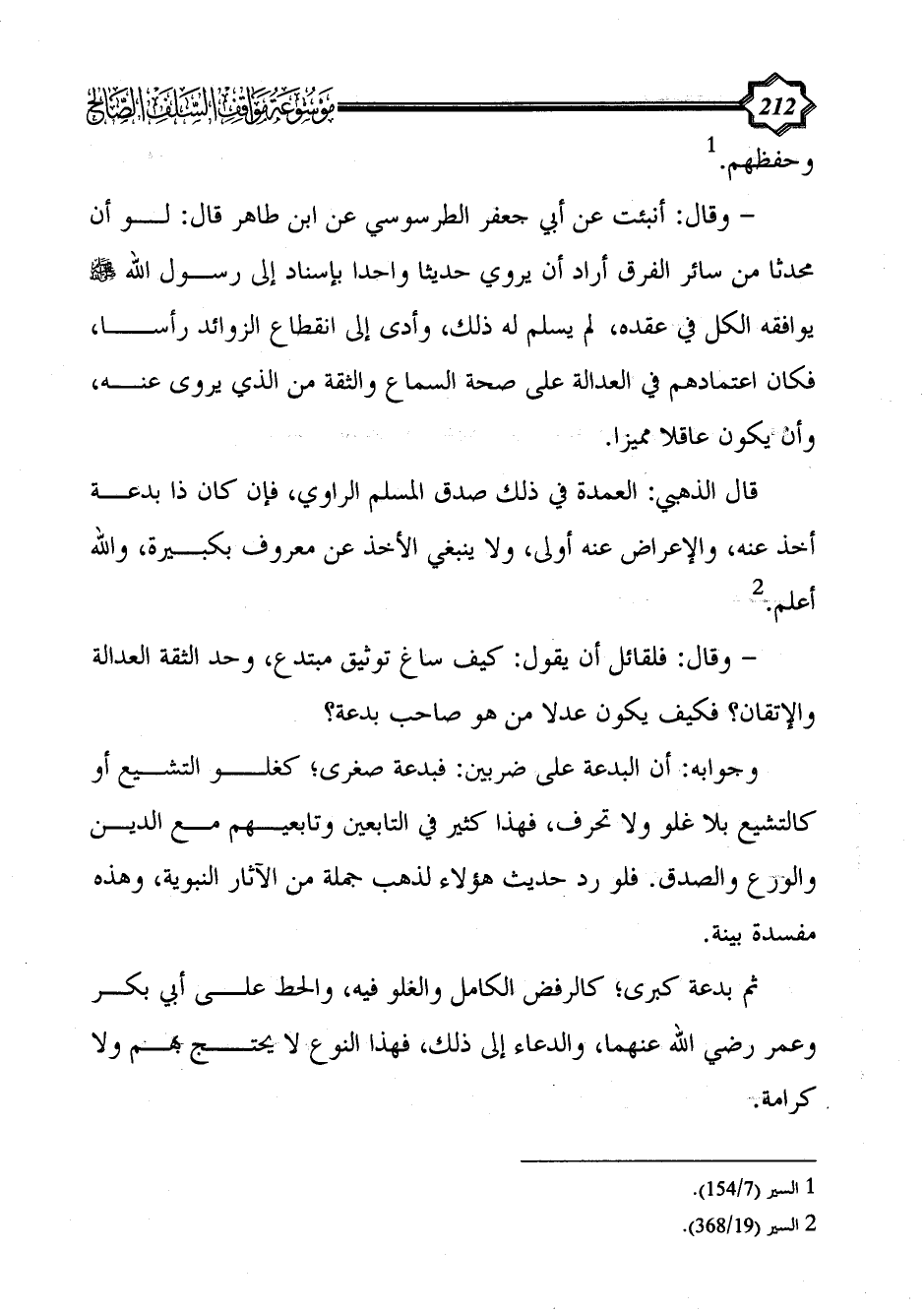 وجوابه: أن البدعة على ضربين: فبدعة صغرى؛ كغلو التشيع أو كالتشيع بلا غلو ولا تحرف، فهذا كثير في التابعين وتابعيهم مع الدين والورع والصدق. فلو رد حديث هؤلاء لذهب جملة من الآثار النبوية، وهذه مفسدة بينة.