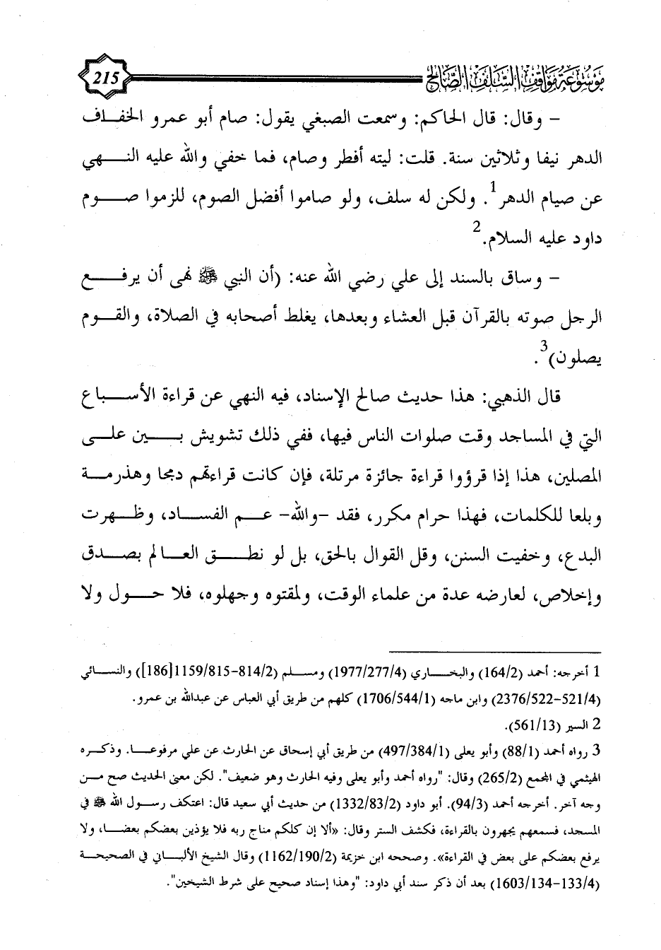 قال الذهبي: هذا حديث صالح الإسناد، فيه النهي عن قراءة الأسباع التي في المساجد وقت صلوات الناس فيها، ففي ذلك تشويش بين على المصلين، هذا إذا قرؤوا قراءة جائزة مرتلة، فإن كانت قراءتهم دمجا وهذرمة وبلعا للكلمات، فهذا حرام مكرر، فقد -والله- عم الفساد، وظهرت البدع، وخفيت السنن، وقل القوال بالحق، بل لو نطق العالم بصدق وإخلاص، لعارضه عدة من علماء الوقت، ولمقتوه وجهلوه، فلا حول ولا