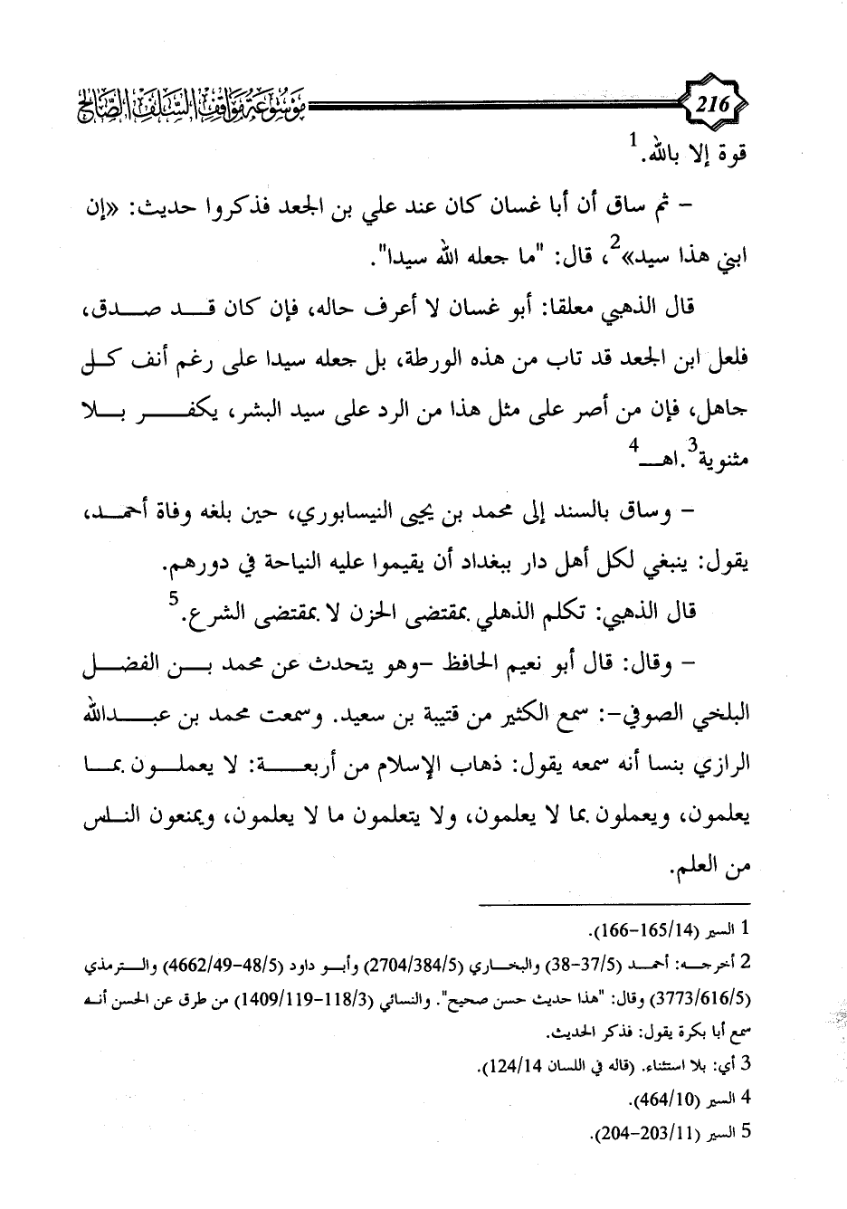 - ثم ساق أن أبا غسان كان عند علي بن الجعد فذكروا حديث: «إن ابني هذا سيد» (¬2)، قال: "ما جعله الله سيدا".