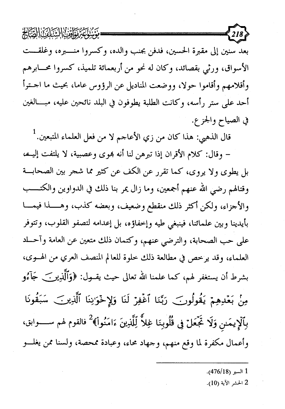 - وقال: كلام الأقران إذا تبرهن لنا أنه بهوى وعصبية، لا يلتفت إليه، بل يطوى ولا يروى، كما تقرر عن الكف عن كثير مما شجر بين الصحابة وقتالهم رضي الله عنهم أجمعين، وما زال يمر بنا ذلك في الدواوين والكتب والأجزاء، ولكن أكثر ذلك منقطع وضعيف، وبعضه كذب، وهذا فيما بأيدينا وبين علمائنا، فينبغي طيه وإخفاؤه، بل إعدامه لتصفو القلوب، وتتوفر على حب الصحابة، والترضي عنهم، وكتمان ذلك متعين عن العامة وآحاد العلماء، وقد يرخص في مطالعة ذلك خلوة للعالم المنصف العري من الهوى، بشرط أن يستغفر لهم، كما علمنا الله تعالى حيث يقول: {وَالَّذِينَ جَاءُوا مِنْ بَعْدِهِمْ يَقُولُونَ رَبَّنَا اغْفِرْ لَنَا وَلِإِخْوَانِنَا الَّذِينَ سَبَقُونَا بِالْإِيمَانِ وَلَا تَجْعَلْ فِي قُلُوبِنَا غِلًّا لِلَّذِينَ آَمَنُوا} (¬2) فالقوم لهم سوابق، وأعمال مكفرة لما وقع منهم، وجهاد محاء، وعبادة ممحصة، ولسنا ممن يغلو
