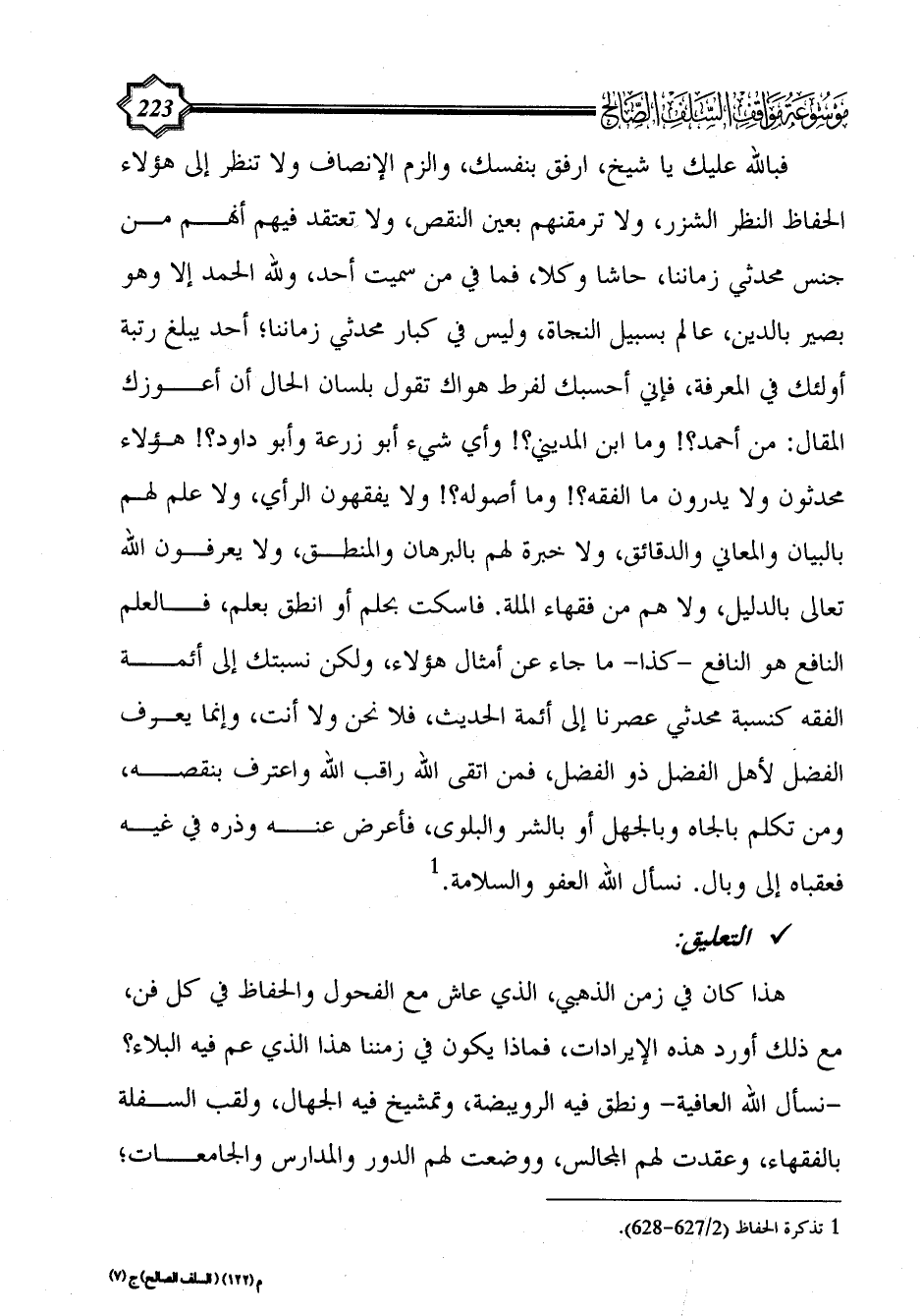 فبالله عليك يا شيخ، ارفق بنفسك، والزم الإنصاف ولا تنظر إلى هؤلاء الحفاظ النظر الشزر، ولا ترمقنهم بعين النقص، ولا تعتقد فيهم أنهم من جنس محدثي زماننا، حاشا وكلا، فما في من سميت أحد، ولله الحمد إلا وهو بصير بالدين، عالم بسبيل النجاة، وليس في كبار محدثي زماننا؛ أحد يبلغ رتبة أولئك في المعرفة، فإني أحسبك لفرط هواك تقول بلسان الحال أن أعوزك المقال: من أحمد؟! وما ابن المديني؟! وأي شيء أبو زرعة وأبو داود؟! هؤلاء محدثون ولا يدرون ما الفقه؟! وما أصوله؟! ولا يفقهون الرأي، ولا علم لهم بالبيان والمعاني والدقائق، ولا خبرة لهم بالبرهان والمنطق، ولا يعرفون الله تعالى بالدليل، ولا هم من فقهاء الملة. فاسكت بحلم أو انطق بعلم، فالعلم النافع هو النافع -كذا- ما جاء عن أمثال هؤلاء، ولكن نسبتك إلى أئمة الفقه كنسبة محدثي عصرنا إلى أئمة الحديث، فلا نحن ولا أنت، وإنما يعرف الفضل لأهل الفضل ذو الفضل، فمن اتقى الله راقب الله واعترف بنقصه، ومن تكلم بالجاه وبالجهل أو بالشر والبلوى، فأعرض عنه وذره في غيه فعقباه إلى وبال. نسأل الله العفو والسلامة. (¬1)