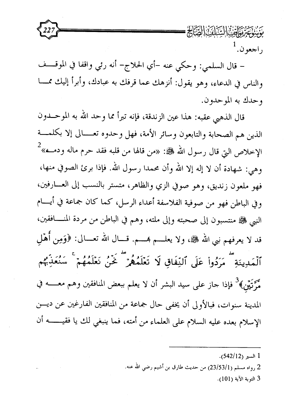 قال الذهبي عقبه: هذا عين الزندقة، فإنه تبرأ مما وحد الله به الموحدون الذين هم الصحابة والتابعون وسائر الأمة، فهل وحدوه تعالى إلا بكلمة الإخلاص التي قال رسول الله - صلى الله عليه وسلم -: «من قالها من قلبه فقد حرم ماله ودمه» (¬2) وهي: شهادة أن لا إله إلا الله وأن محمدا رسول الله. فإذا برئ الصوفي منها، فهو ملعون زنديق، وهو صوفي الزي والظاهر، متستر بالنسب إلى العارفين، وفي الباطن فهو من صوفية الفلاسفة أعداء الرسل، كما كان جماعة في أيام النبي - صلى الله عليه وسلم - منتسبون إلى صحبته وإلى ملته، وهم في الباطن من مردة المنافقين، قد لا يعرفهم نبي الله - صلى الله عليه وسلم -، ولا يعلم بهم. قال الله تعالى: {وَمِنْ أَهْلِ الْمَدِينَةِ مَرَدُوا عَلَى النِّفَاقِ لَا تَعْلَمُهُمْ نَحْنُ نَعْلَمُهُمْ سَنُعَذِّبُهُمْ مَرَّتَيْنِ} (¬3) فإذا جاز على سيد البشر أن لا يعلم ببعض المنافقين وهم معه في المدينة سنوات، فبالأولى أن يخفى حال جماعة من المنافقين الفارغين عن دين الإسلام بعده عليه السلام على العلماء من أمته، فما ينبغي لك يا فقيه أن