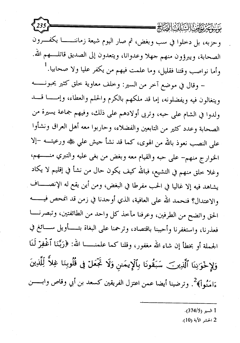 - وقال في موضع آخر من السير: وخلف معاوية خلق كثير يحبونه ويتغالون فيه ويفضلونه، إما قد ملكهم بالكرم والحلم والعطاء، وإما قد ولدوا في الشام على حبه، وتربى أولادهم على ذلك، وفيهم جماعة يسيرة من الصحابة وعدد كثير من التابعين والفضلاء، وحاربوا معه أهل العراق ونشأوا على النصب نعوذ بالله من الهوى، كما قد نشأ جيش علي - رضي الله عنه - ورعيته -إلا الخوارج منهم- على حبه والقيام معه وبغض من بغى عليه والتبري منهم، وغلا خلق منهم في التشيع، فبالله كيف يكون حال من نشأ في إقليم لا يكاد يشاهد فيه إلا غاليا في الحب مفرطا في البغض، ومن أين يقع له الإنصاف والاعتدال؟ فنحمد الله على العافية، الذي أوجدنا في زمن قد انمحص فيه الحق واتضح من الطرفين، وعرفنا مآخذ كل واحد من الطائفتين، وتبصرنا فعذرنا، واستغفرنا وأحببنا باقتصاد، وترحمنا على البغاة بتأويل سائغ في الجملة أو بخطأ إن شاء الله مغفور، وقلنا كما علمنا الله: {رَبَّنَا اغْفِرْ لَنَا وَلِإِخْوَانِنَا الَّذِينَ سَبَقُونَا بِالْإِيمَانِ وَلَا تَجْعَلْ فِي قُلُوبِنَا غِلًّا لِلَّذِينَ آَمَنُوا} (¬2). وترضينا أيضا عمن اعتزل الفريقين كسعد بن أبي وقاص وابن