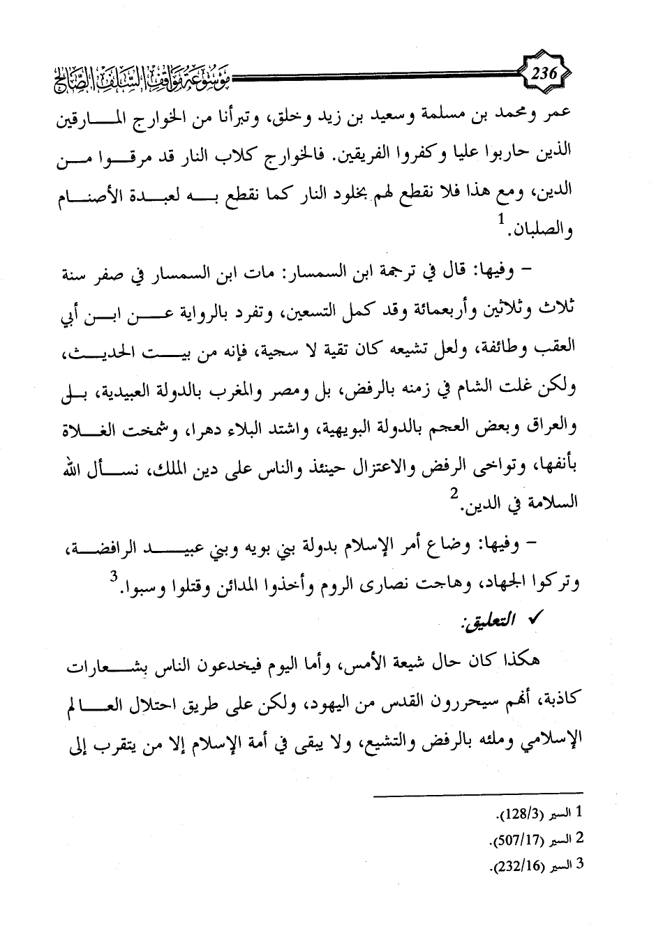 - وفيها: قال في ترجمة ابن السمسار: مات ابن السمسار في صفر سنة ثلاث وثلاثين وأربعمائة وقد كمل التسعين، وتفرد بالرواية عن ابن أبي العقب وطائفة، ولعل تشيعه كان تقية لا سجية، فإنه من بيت الحديث، ولكن غلت الشام في زمنه بالرفض، بل ومصر والمغرب بالدولة العبيدية، بل والعراق وبعض العجم بالدولة البويهية، واشتد البلاء دهرا، وشمخت الغلاة بأنفها، وتواخى الرفض والاعتزال حينئذ والناس على دين الملك، نسأل الله السلامة في الدين. (¬2)