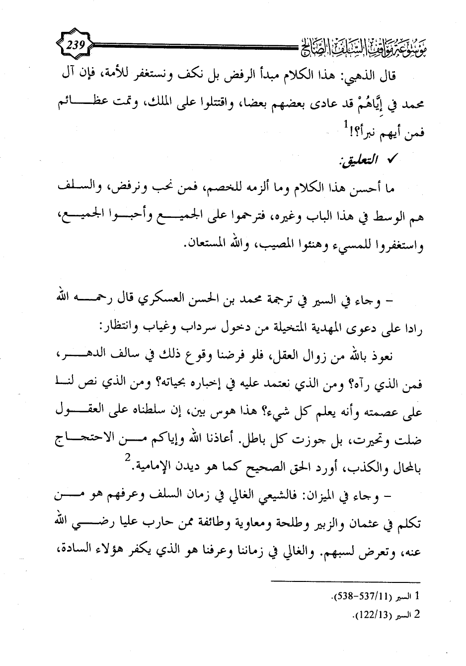 - وجاء في السير في ترجمة محمد بن الحسن العسكري قال رحمه الله رادا على دعوى المهدية المتخيلة من دخول سرداب وغياب وانتظار: