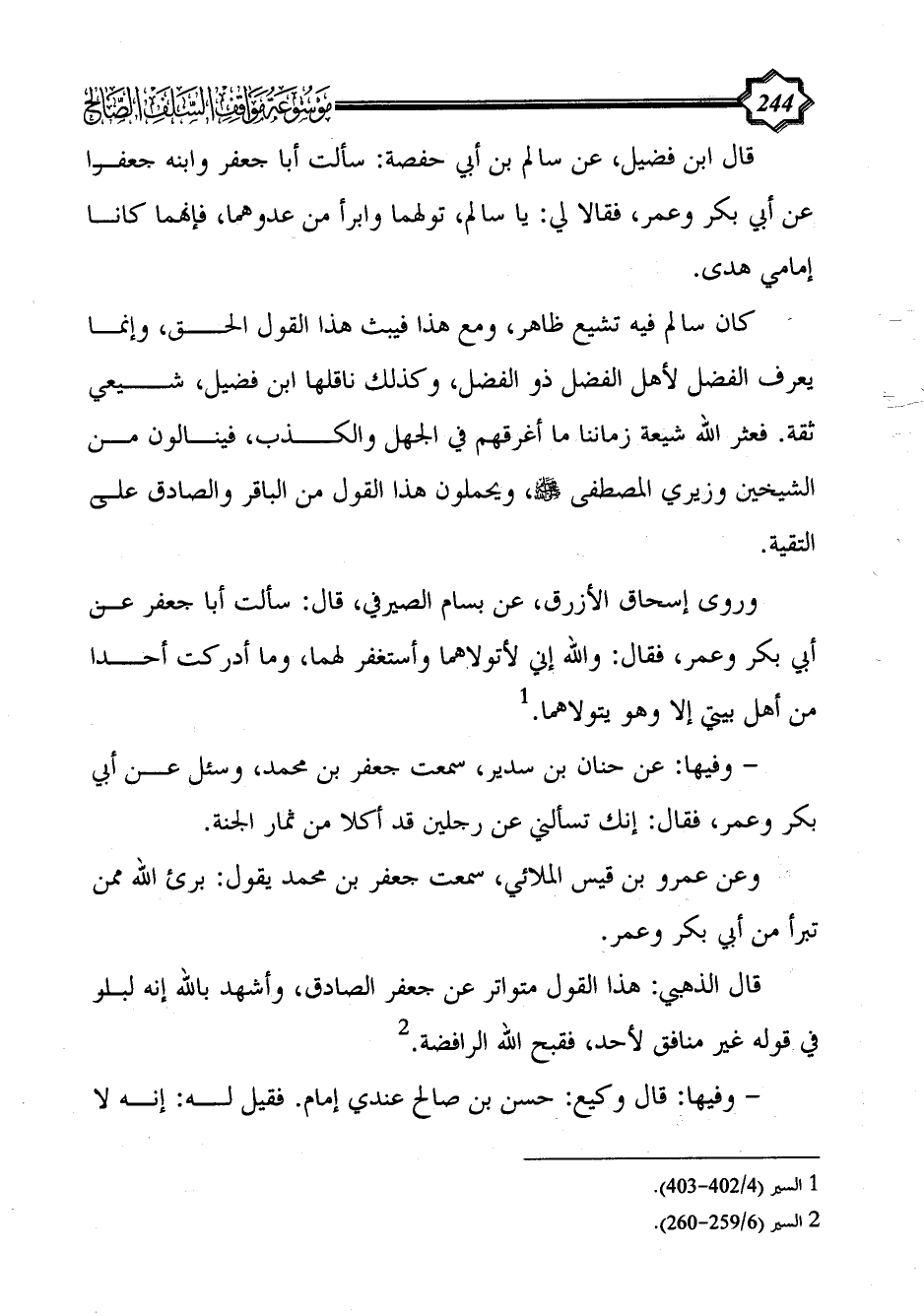 قال ابن فضيل، عن سالم بن أبي حفصة: سألت أبا جعفر وابنه جعفرا عن أبي بكر وعمر، فقالا لي: يا سالم، تولهما وابرأ من عدوهما، فإنهما كانا إمامي هدى.