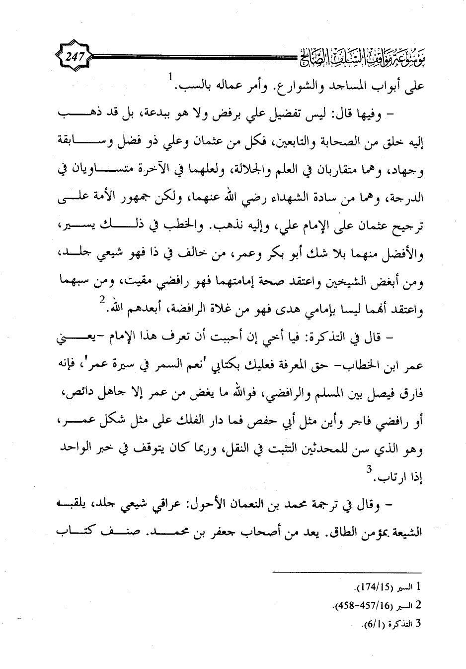 - وفيها قال: ليس تفضيل علي برفض ولا هو ببدعة، بل قد ذهب إليه خلق من الصحابة والتابعين، فكل من عثمان وعلي ذو فضل وسابقة وجهاد، وهما متقاربان في العلم والجلالة، ولعلهما في الآخرة متساويان في الدرجة، وهما من سادة الشهداء رضي الله عنهما، ولكن جمهور الأمة على ترجيح عثمان على الإمام علي، وإليه نذهب. والخطب في ذلك يسير، والأفضل منهما بلا شك أبو بكر وعمر، من خالف في ذا فهو شيعي جلد، ومن أبغض الشيخين واعتقد صحة إمامتهما فهو رافضي مقيت، ومن سبهما واعتقد أنهما ليسا بإمامي هدى فهو من غلاة الرافضة، أبعدهم الله. (¬2)