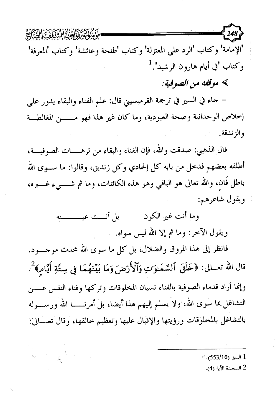 فانظر إلى هذا المروق والضلال، بل كل ما سوى الله محدث موجود. قال الله تعالى: {خَلَقَ السَّمَاوَاتِ وَالْأَرْضَ وَمَا بَيْنَهُمَا فِي سِتَّةِ أَيَّامٍ} (¬2). وإنما أراد قدماء الصوفية بالفناء نسيان المخلوقات وتركها وفناء النفس عن التشاغل بما سوى الله، ولا يسلم إليهم هذا أيضا، بل أمرنا الله ورسوله بالتشاغل بالمخلوقات ورؤيتها والإقبال عليها وتعظيم خالقها، وقال تعالى: