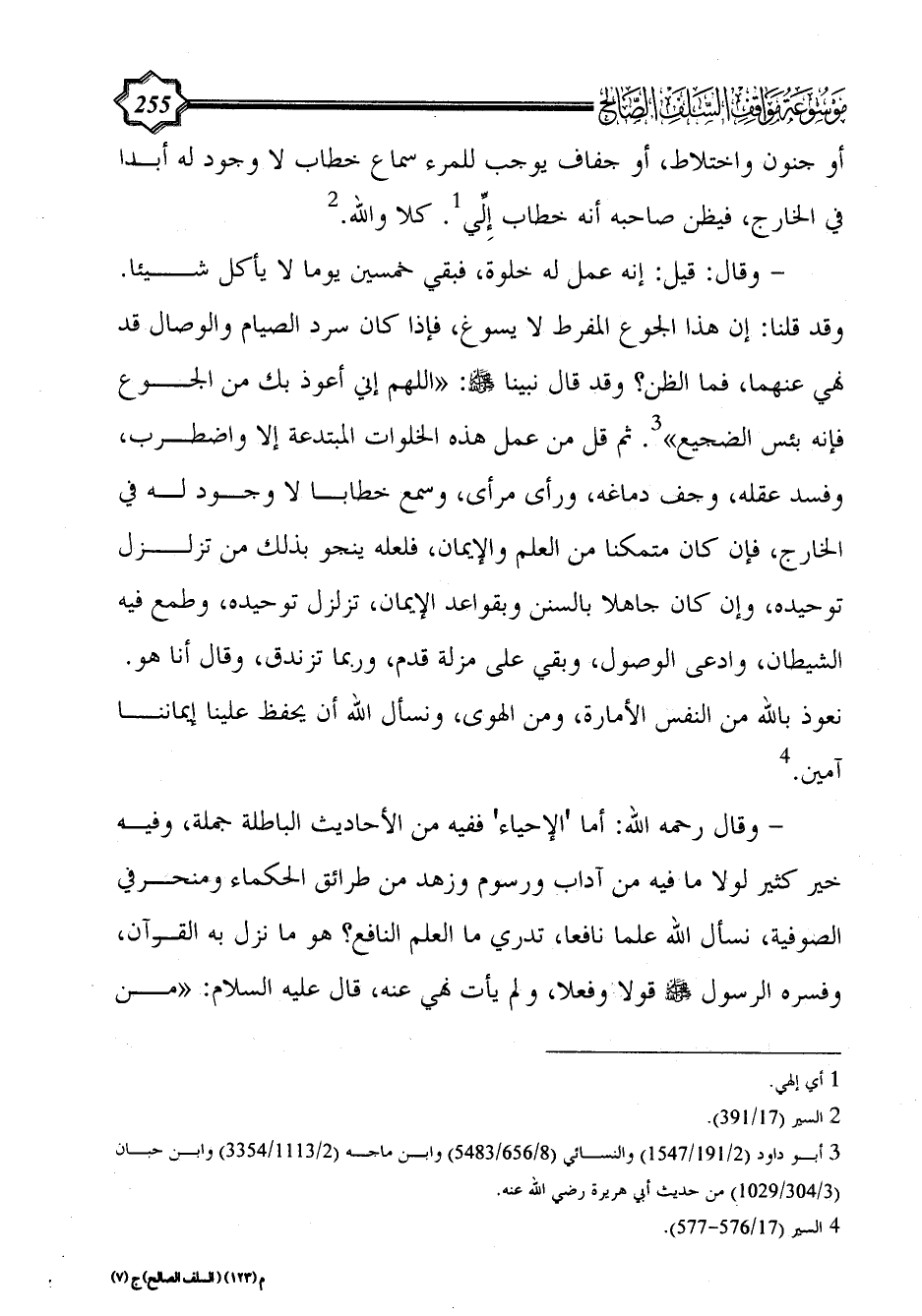 - وقال: قيل: إنه عمل له خلوة، فبقي خمسين يوما لا يأكل شيئا. وقد قلنا: إن هذا الجوع المفرط لا يسوغ، فإذا كان سرد الصيام والوصال قد نهي عنهما، فما الظن؟ وقد قال نبينا - صلى الله عليه وسلم -: «اللهم إني أعوذ بك من الجوع فإنه بئس الضجيع» (¬3). ثم قل من عمل هذه الخلوات المبتدعة إلا واضطرب، وفسد عقله، وجف دماغه، ورأى مرأى، وسمع خطابا لا وجود له في الخارج، فإن كان متمكنا من العلم والإيمان، فلعله ينجو بذلك من تزلزل توحيده، وإن كان جاهلا بالسنن وبقواعد الإيمان، تزلزل توحيده، وطمع فيه الشيطان، وادعى الوصول، وبقي على مزلة قدم، وربما تزندق، وقال أنا هو. نعوذ بالله من النفس الأمارة، ومن الهوى، ونسأل الله أن يحفظ علينا إيماننا آمين. (¬4)