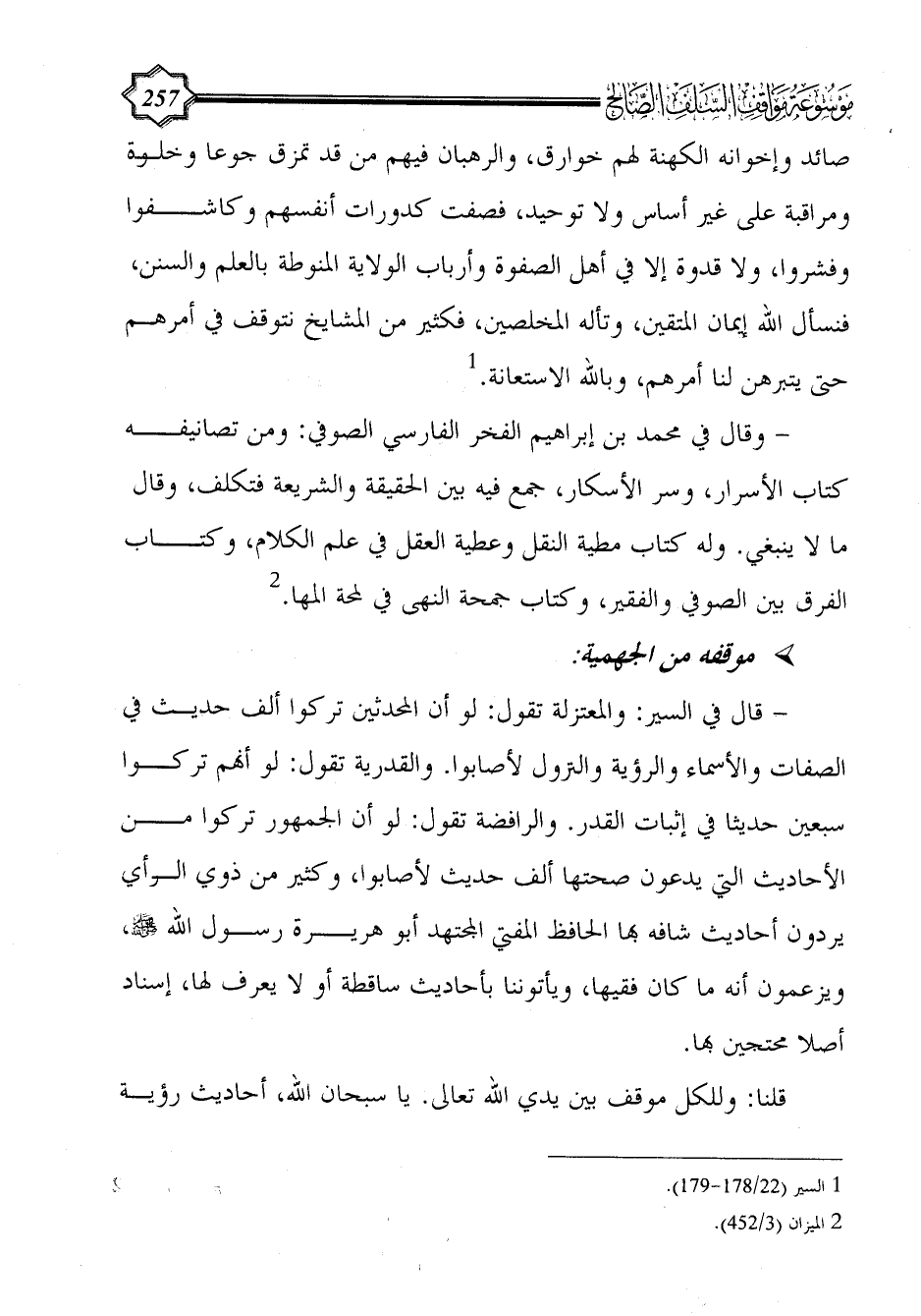 - وقال في محمد بن إبراهيم الفخر الفارسي الصوفي: ومن تصانيفه كتاب الأسرار، وسر الأسكار، جمع فيه بين الحقيقة والشريعة فتكلف، وقال ما لا ينبغي. وله كتاب مطية النقل وعطية العقل في علم الكلام، وكتاب الفرق بين الصوفي والفقير، وكتاب جمحة النهى في لمحة المها. (¬2)