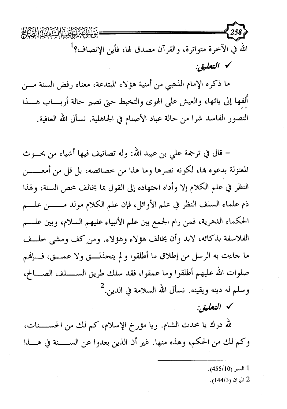 - قال في ترجمة علي بن عبيد الله: وله تصانيف فيها أشياء من بحوث المعتزلة بدعوه بها، لكونه نصرها وما هذا من خصائصه، بل قل من أمعن النظر في علم الكلام إلا وأداه اجتهاده إلى القول بما يخالف محض السنة، ولهذا ذم علماء السلف النظر في علم الأوائل، فإن علم الكلام مولد من علم الحكماء الدهرية، فمن رام الجمع بين علم الأنبياء عليهم السلام، وبين علم الفلاسفة بذكائه، لابد وأن يخالف هؤلاء وهؤلاء. ومن كف ومشى خلف ما جاءت به الرسل من إطلاق ما أطلقوا ولم يتحذلق ولا عمق، فإنهم صلوات الله عليهم أطلقوا وما عمقوا، فقد سلك طريق السلف الصالح، وسلم له دينه ويقينه. نسأل الله السلامة في الدين. (¬2)