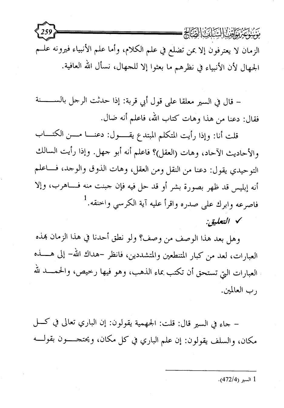 - جاء في السير قال: قلت: الجهمية يقولون: إن الباري تعالى في كل مكان، والسلف يقولون: إن علم الباري في كل مكان، ويحتجون بقوله