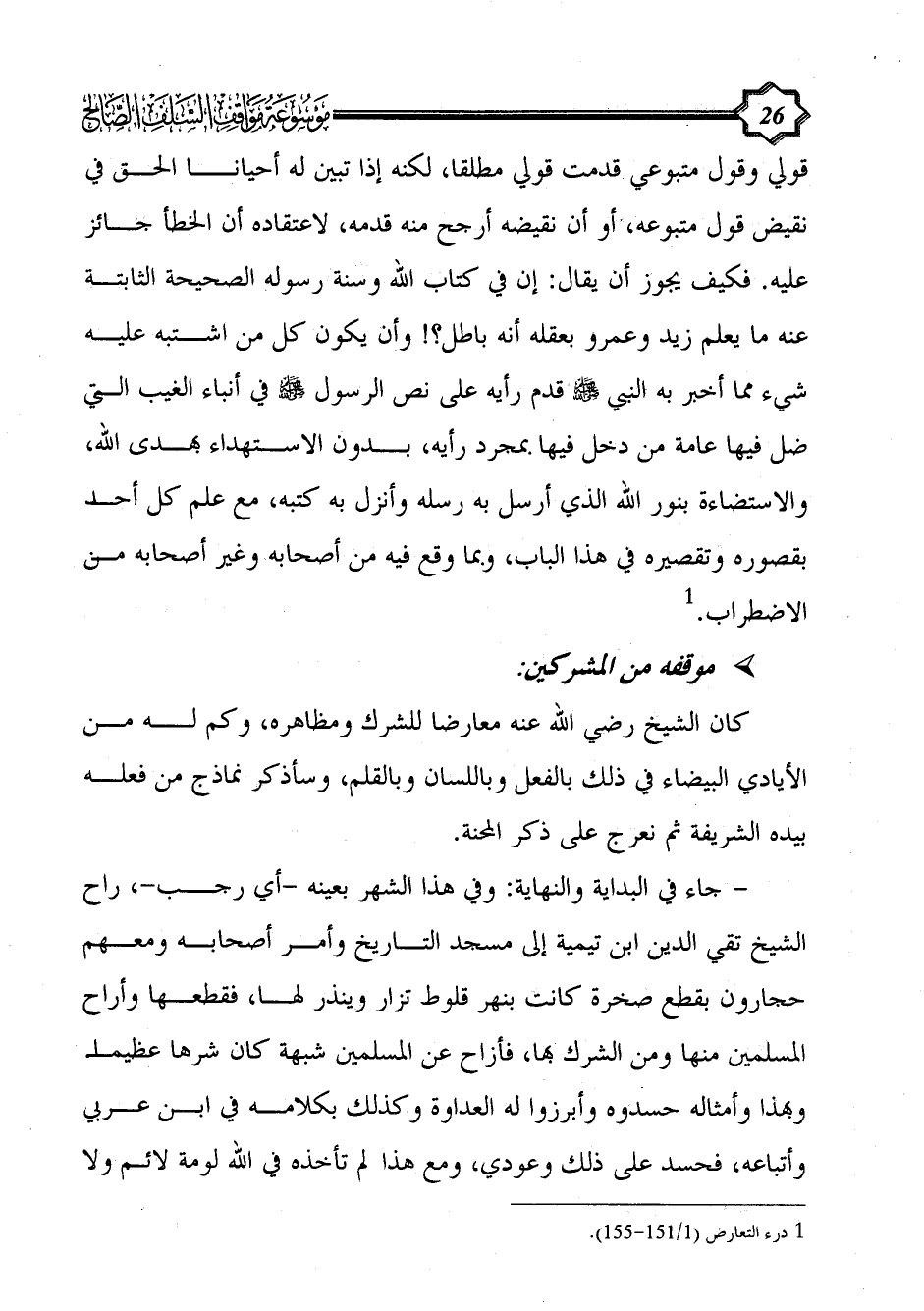 قولي وقول متبوعي قدمت قولي مطلقا، لكنه إذا تبين له أحيانا الحق في نقيض قول متبوعه، أو أن نقيضه أرجح منه قدمه، لاعتقاده أن الخطأ جائز عليه. فكيف يجوز أن يقال: إن في كتاب الله وسنة رسوله الصحيحة الثابتة عنه ما يعلم زيد وعمرو بعقله أنه باطل؟! وأن يكون كل من اشتبه عليه شيء مما أخبر به النبي - صلى الله عليه وسلم - قدم رأيه على نص الرسول - صلى الله عليه وسلم - في أنباء الغيب التي ضل فيها عامة من دخل فيها بمجرد رأيه، بدون الاستهداء بهدى الله، والاستضاءة بنور الله الذي أرسل به رسله وأنزل به كتبه، مع علم كل أحد بقصوره وتقصيره في هذا الباب، وبما وقع فيه من أصحابه وغير أصحابه من الاضطراب. (¬1)