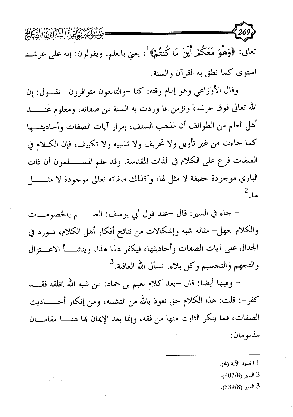 وقال الأوزاعي وهو إمام وقته: كنا -والتابعون متوافرون- نقول: إن الله تعالى فوق عرشه، ونؤمن بما وردت به السنة من صفاته، ومعلوم عند أهل العلم من الطوائف أن مذهب السلف، إمرار آيات الصفات وأحاديثها كما جاءت من غير تأويل ولا تحريف ولا تشبيه ولا تكييف، فإن الكلام في الصفات فرع على الكلام في الذات المقدسة، وقد علم المسلمون أن ذات الباري موجودة حقيقة لا مثل لها، وكذلك صفاته تعالى موجودة لا مثل لها. (¬2)