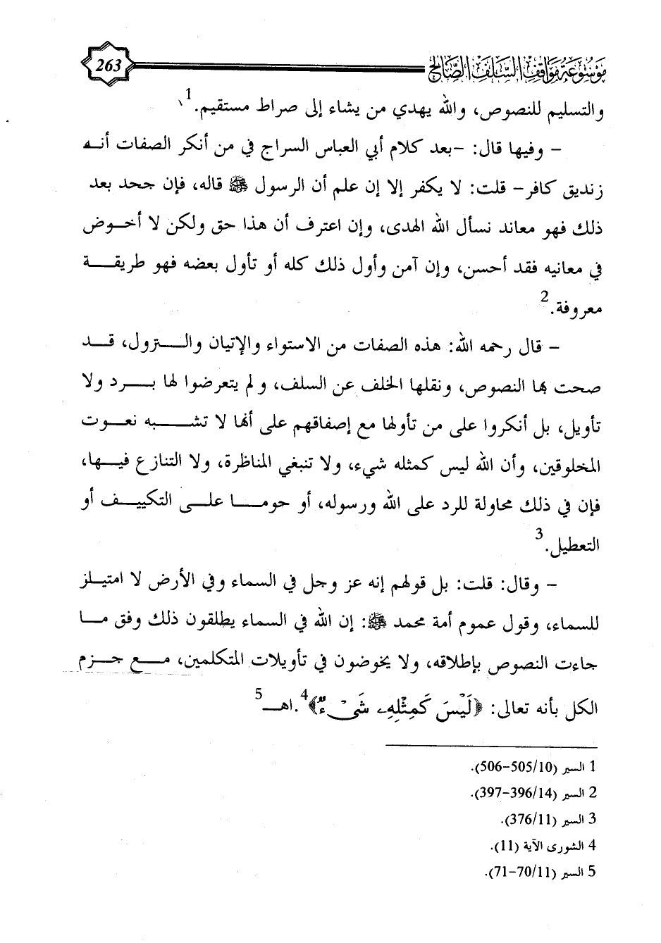 - وقال: قلت: بل قولهم إنه عز وجل في السماء وفي الأرض لا امتياز للسماء، وقول عموم أمة محمد - صلى الله عليه وسلم -: إن الله في السماء يطلقون ذلك وفق ما جاءت النصوص بإطلاقه، ولا يخوضون في تأويلات المتكلمين، مع جزم الكل بأنه تعالى: {لَيْسَ كَمِثْلِهِ شَيْءٌ} (¬4).اهـ (¬5)