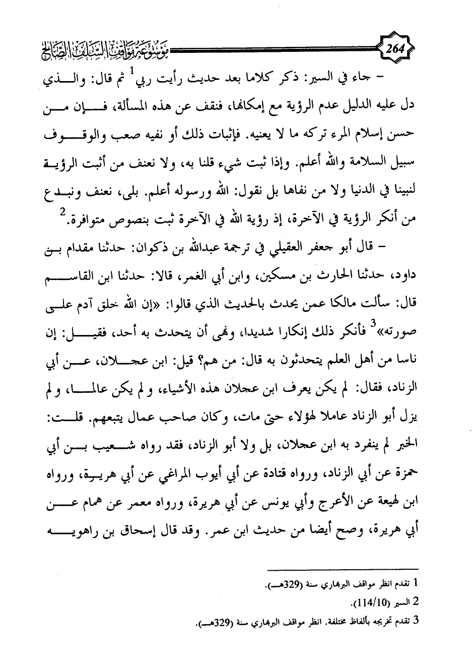 - جاء في السير: ذكر كلاما بعد حديث رأيت ربي (¬1) ثم قال: والذي دل عليه الدليل عدم الرؤية مع إمكانها، فنقف عن هذه المسألة، فإن من حسن إسلام المرء تركه ما لا يعنيه. فإثبات ذلك أو نفيه صعب والوقوف سبيل السلامة والله أعلم. وإذا ثبت شيء قلنا به، ولا نعنف من أثبت الرؤية لنبينا في الدنيا ولا من نفاها بل نقول: الله ورسوله أعلم. بلى، نعنف ونبدع من أنكر الرؤية في الآخرة، إذ رؤية الله في الآخرة ثبت بنصوص متوافرة. (¬2)